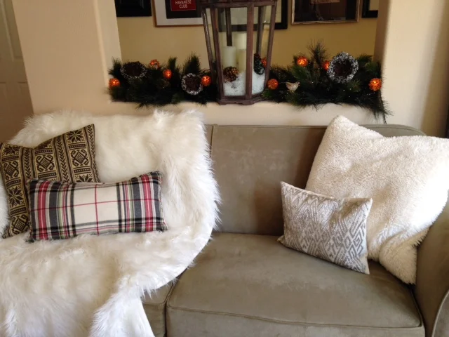 A cozy sheepskin throw with leather, knit and leopard pillows create a comfortable atmosphere in the family room. The following picture shows the matching sofa on the other side of the room, decked out with its own fur throw and plaid pillows for the cabin feel.