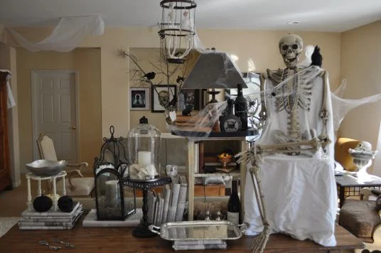 The whole house was decorated to theme, and the main entertaining area was made to resemble a library. We hoisted a skeleton up on a table so when the partygoers came in when the room was crowded, they could still see him as the main decoration.