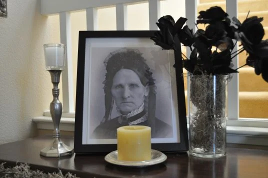 Plastic roses from the dollar store were painted black and placed around the house, and we also set up this "coffin" with a random picture we found online.