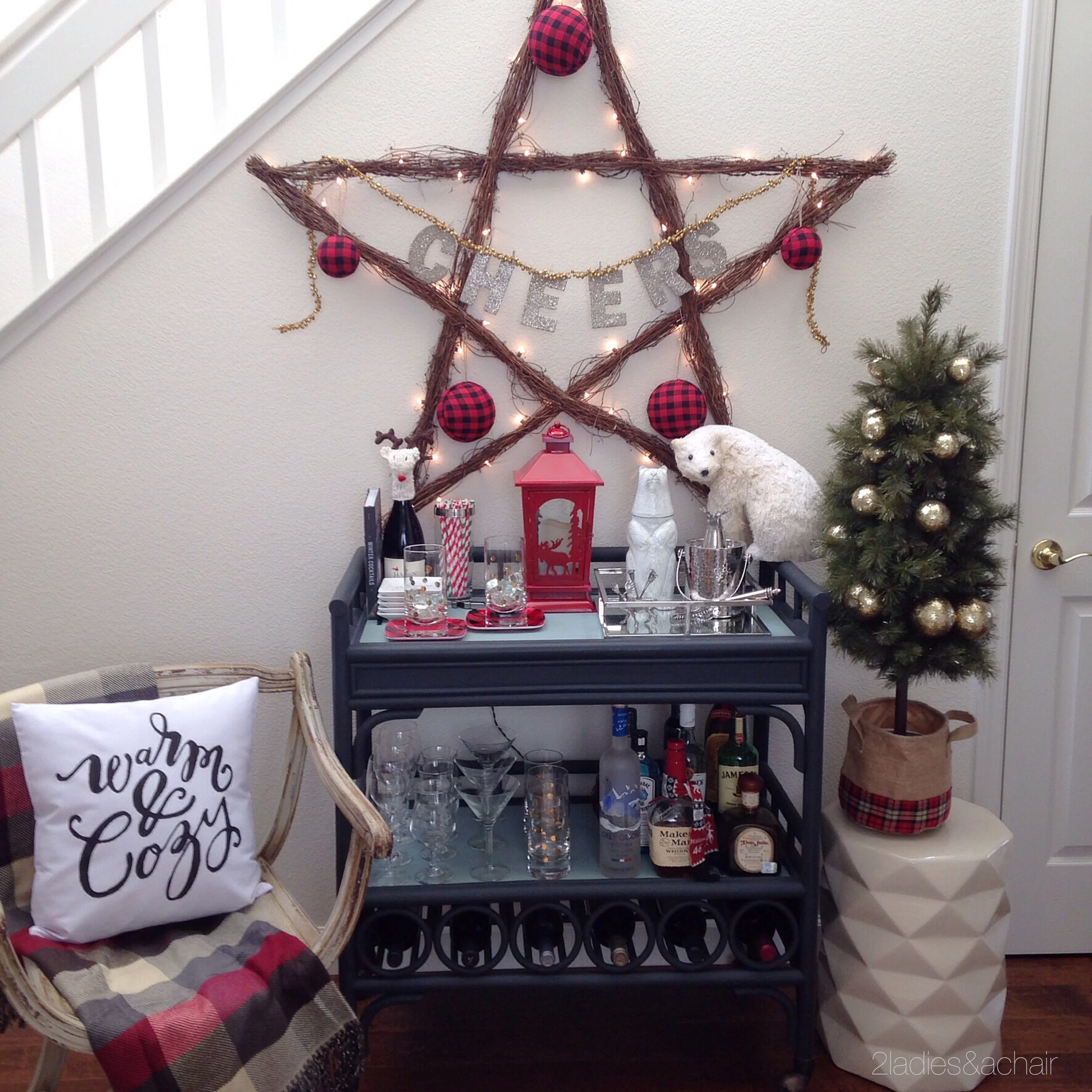 The bar cart is tucked in a cozy spot under the stairwell ready for the holidays!