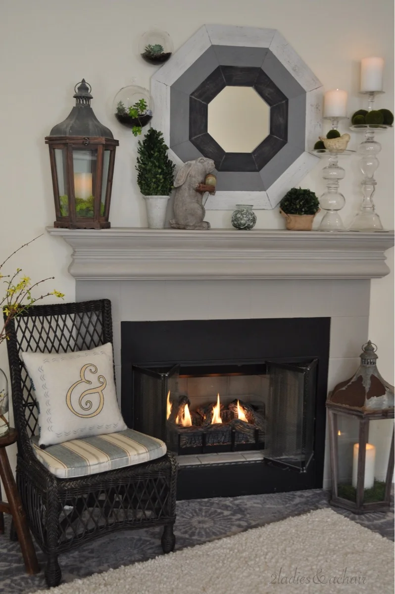 On a recent shopping trip to HomeGoods we found these unique hand blown glass terrariums. The tag read "nourish your home and soul". That inspired 2 Ladies to create an indoor garden-themed mantel!