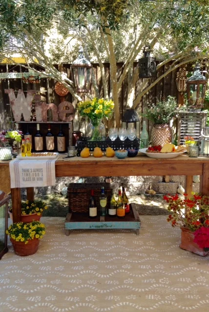 This fabulous "wine" sign from HomeGoods says it all. The distressed curved metal sign sets the mood for a wine tasting party outside under the olive trees. HomeGoods' giant white platter holds appetizers to nibble on, while their white tray is set for olive oil tasting. Their metal cart, complete with wheels, is an interesting place for the wine glasses to be. Put all together we achieved a casual relaxed vibe, perfect for outdoor entertaining. We added plenty of lanterns and candles so our guests can linger over their wine well into the evening hours.