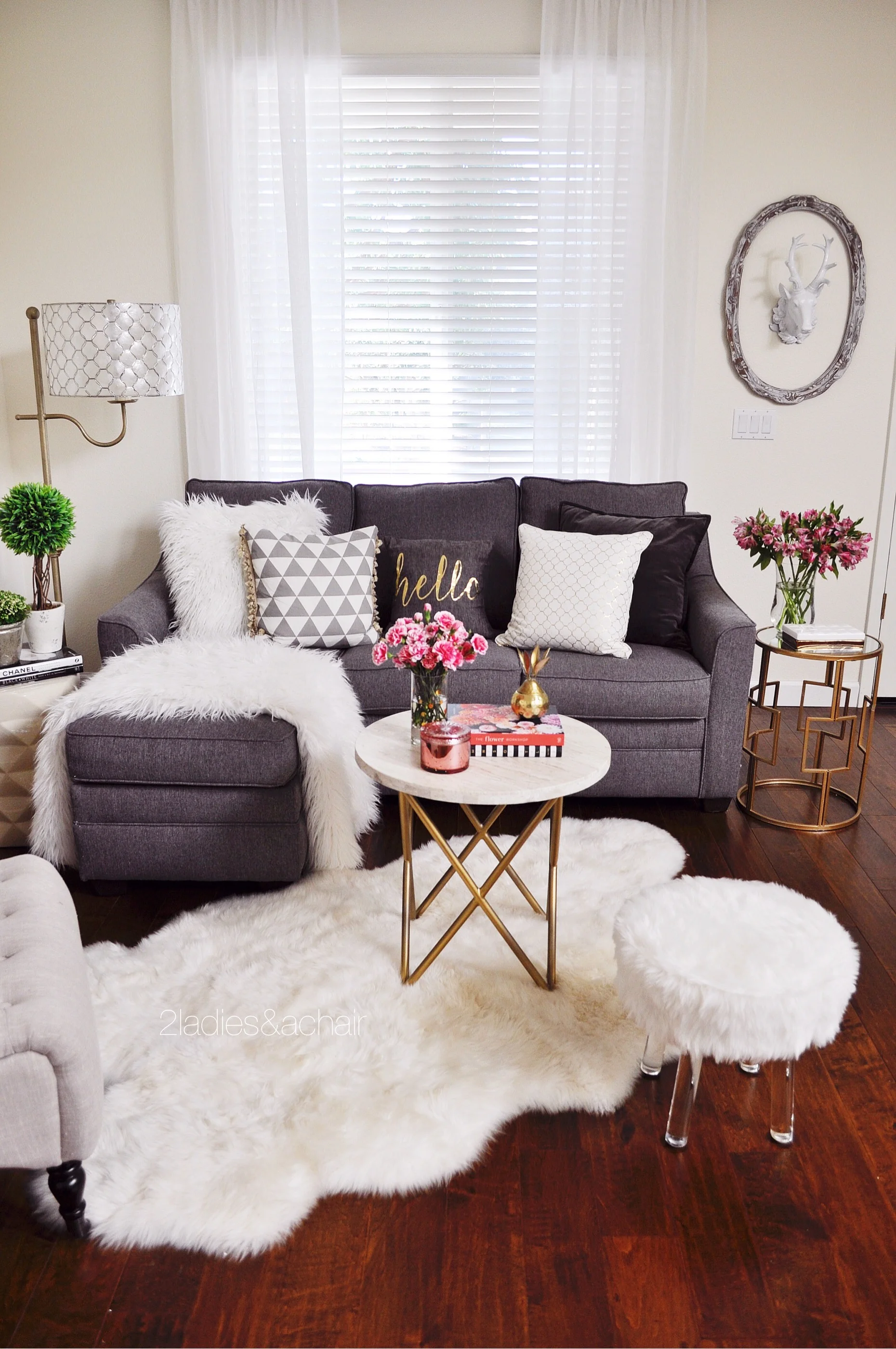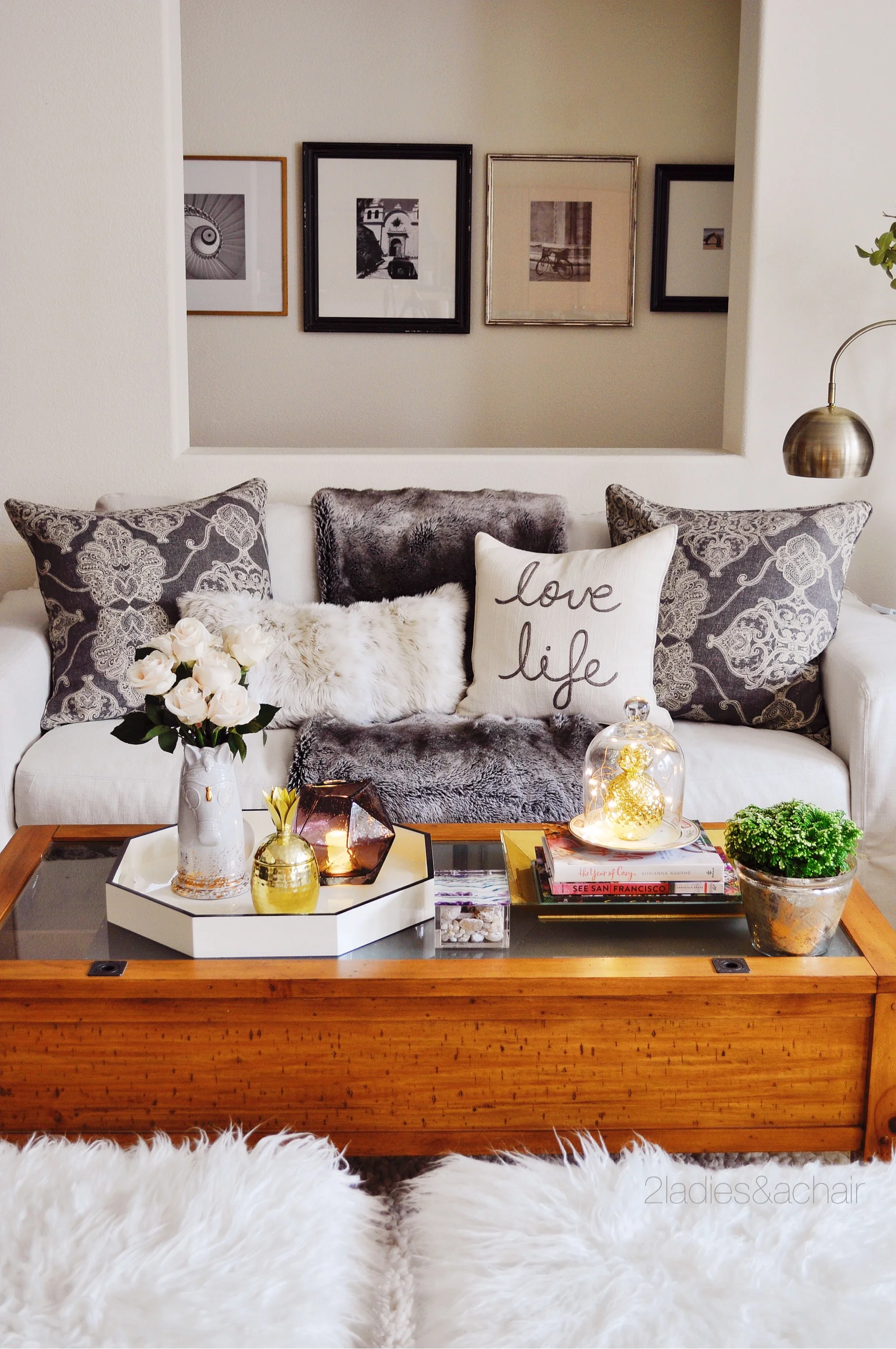 Fresh flowers and plants are a must to lift the mood of a room to light and bright. These topiaries from HomeGoods mixed with live plants and fresh flowers have me thinking of spring and warmer days. Bright white faux fur accessories create a cozy vibe.