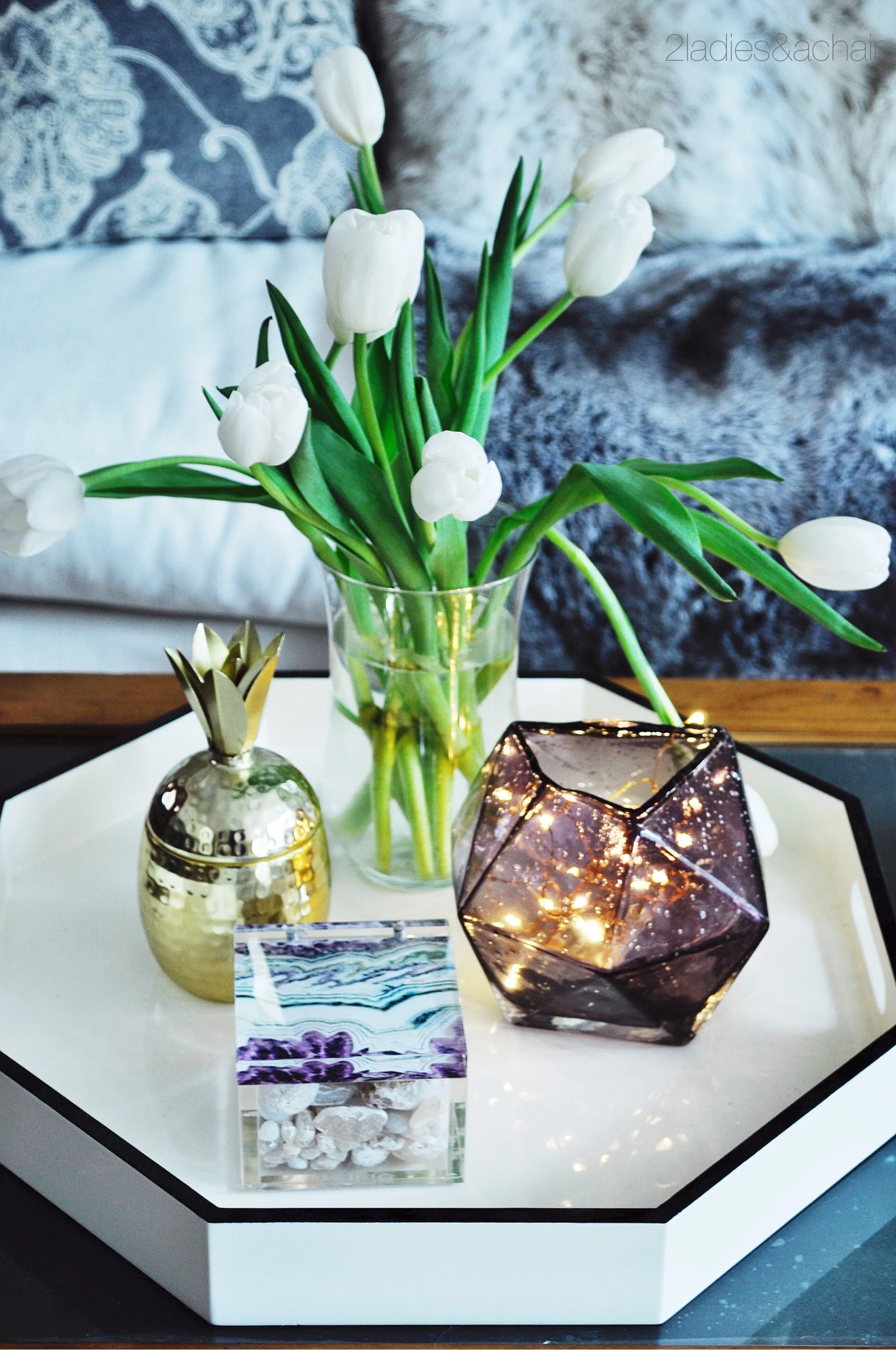 Fresh flowers are a must! I love Trader Joe's for so many reasons but the number one reason is they have tulips in January! More candles and fairy lights. This little lucite box from HomeGoods is filled with moonstones from Cambria, CA reminding me that sun filled beach-combing days are coming soon.