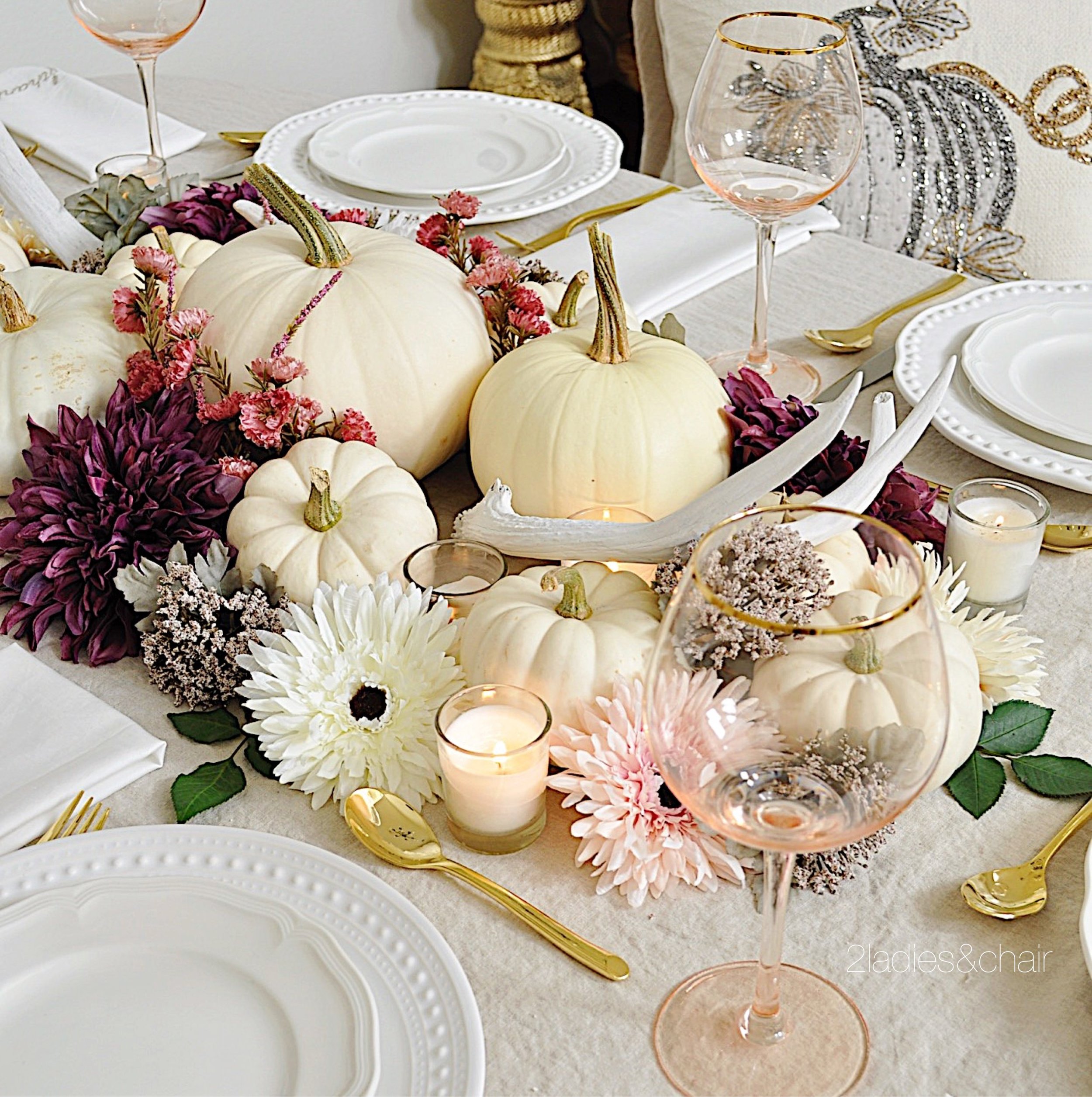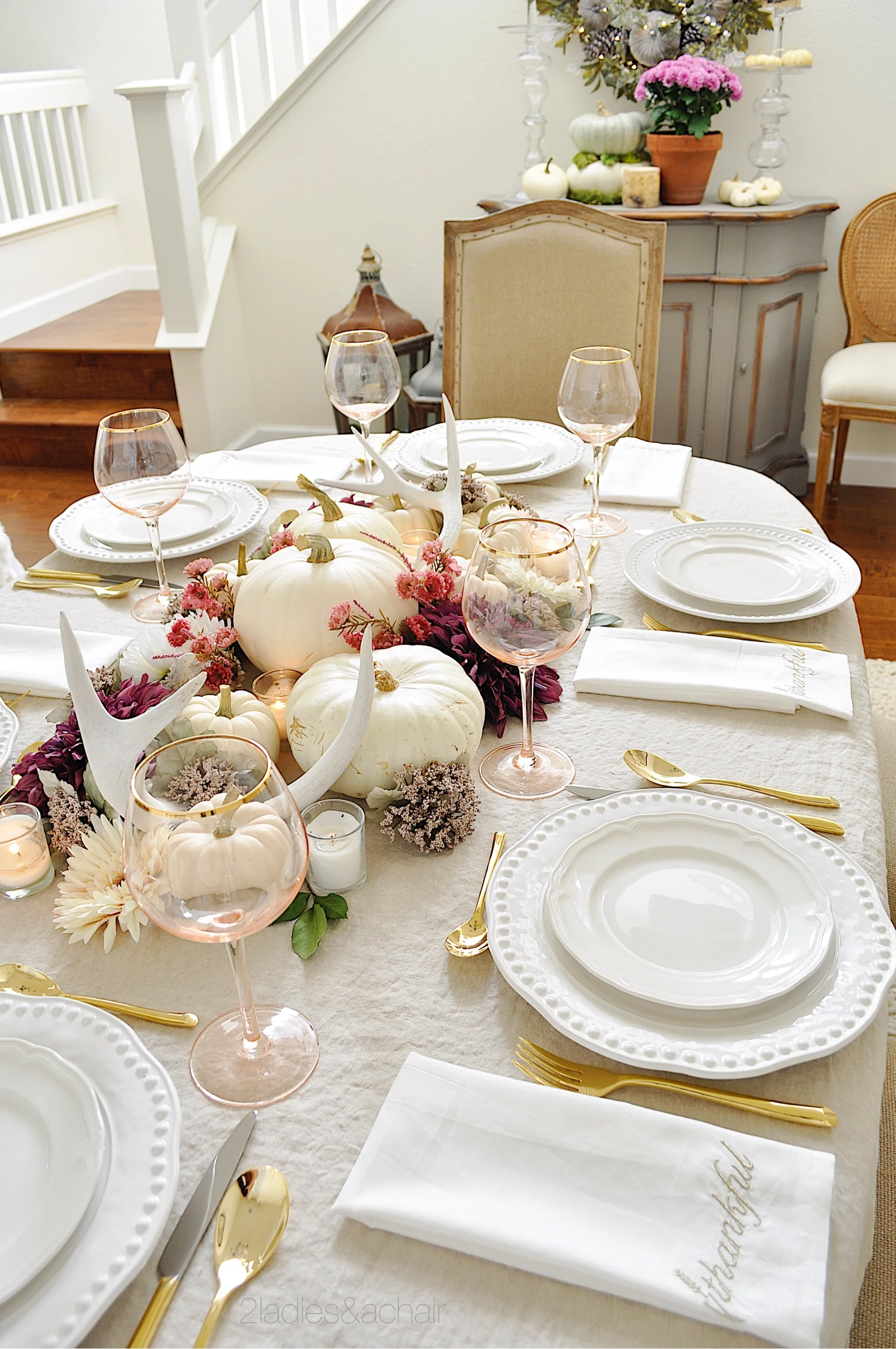 I love pumpkins, so I knew I wanted to incorporate them in my tablescape. Earlier this fall I made a special trip up route 1 to Half Moon Bay to get white pumpkins for a simple neutral fall tablescape. You can see this neutral fall harvest table HERE. These same pumpkins are used on my Thanksgiving table.