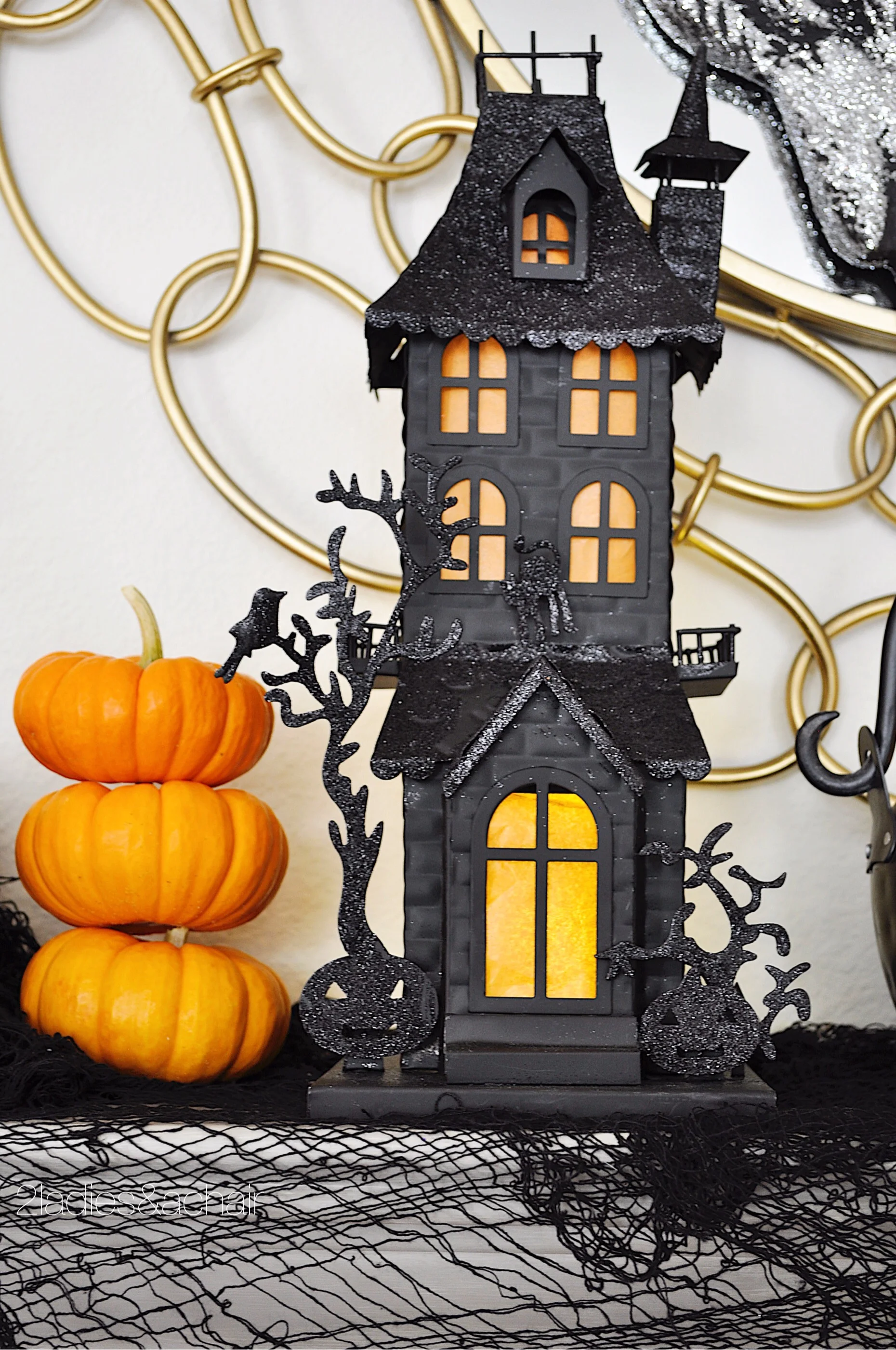I walked into HomeGoods this year looking for Halloween inspiration! It didn't take long. The first decor to catch my eye were these black glitter haunted houses! A haunted house conjures up ghosts, goblins and scary bumps in the night. I added orange tissue paper to the windows in keeping with my black and orange theme. A battery candle lit behind the tissue paper gives a creepy glow at night.