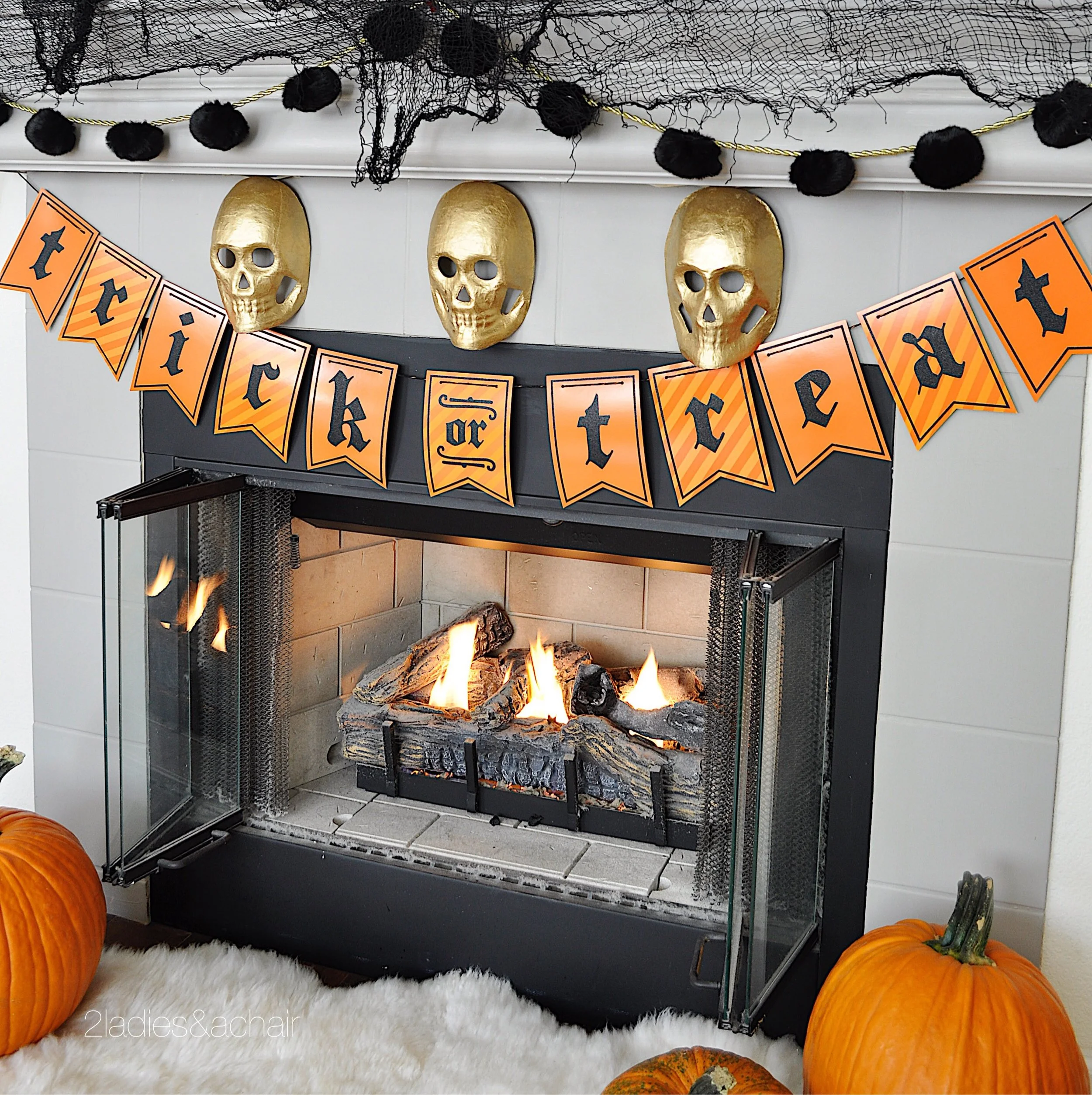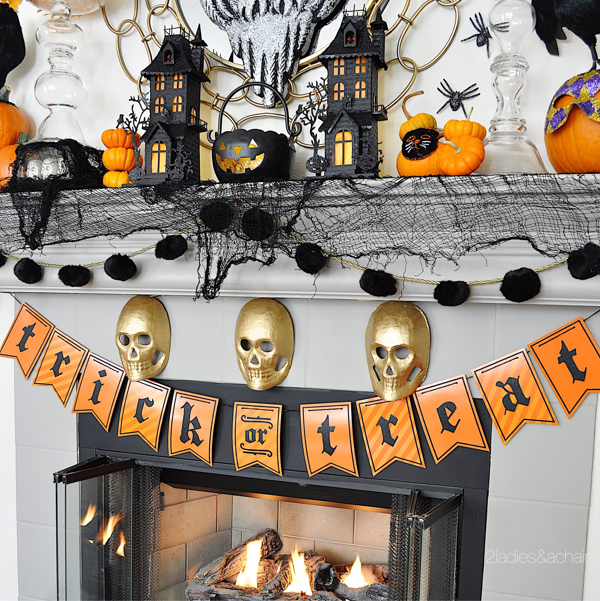 The addition of the trick or treat banner with gothic black glitter lettering went perfectly with my spooky Halloween mantel decorations.