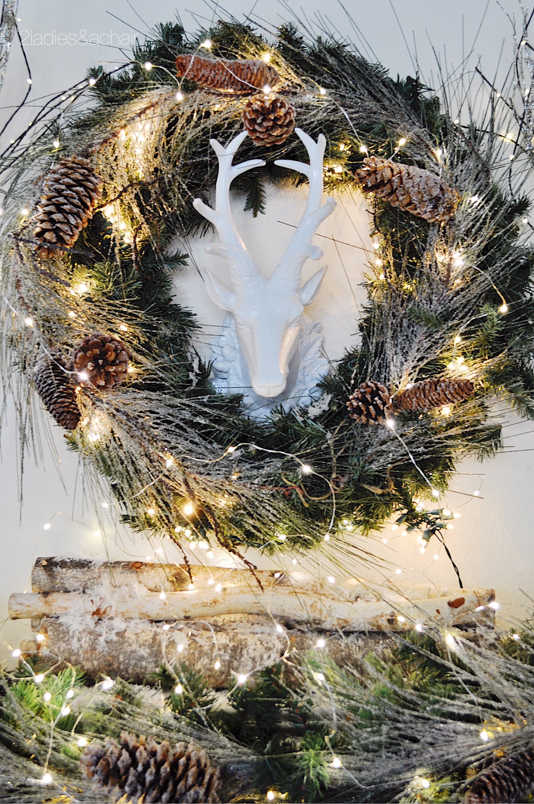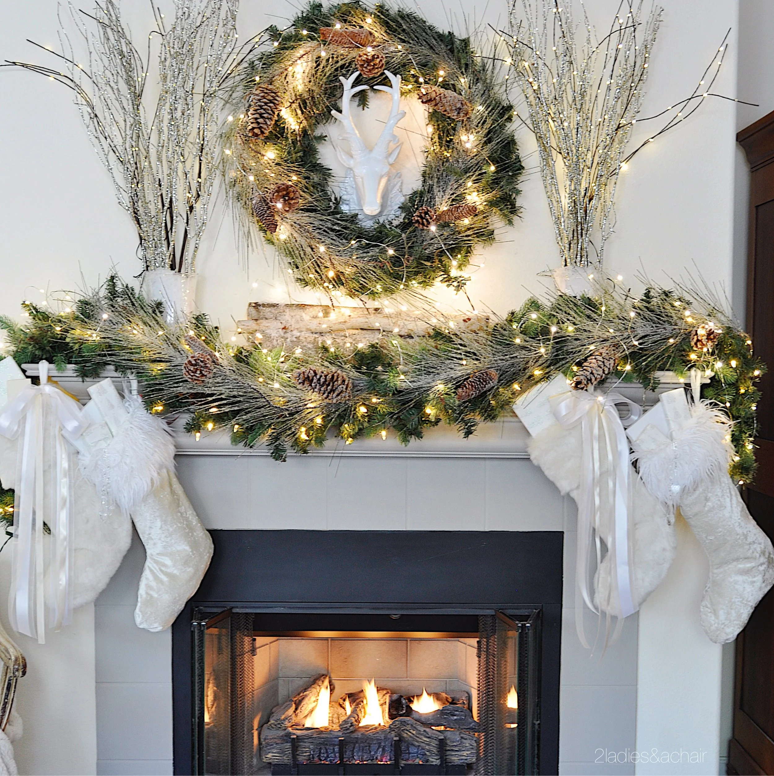For a bit of romantic whimsy, I tied gorgeous ribbons casually to the stockings. A simple stack of birch logs with a faux sprinkling of snow completes the romantic rustic theme.