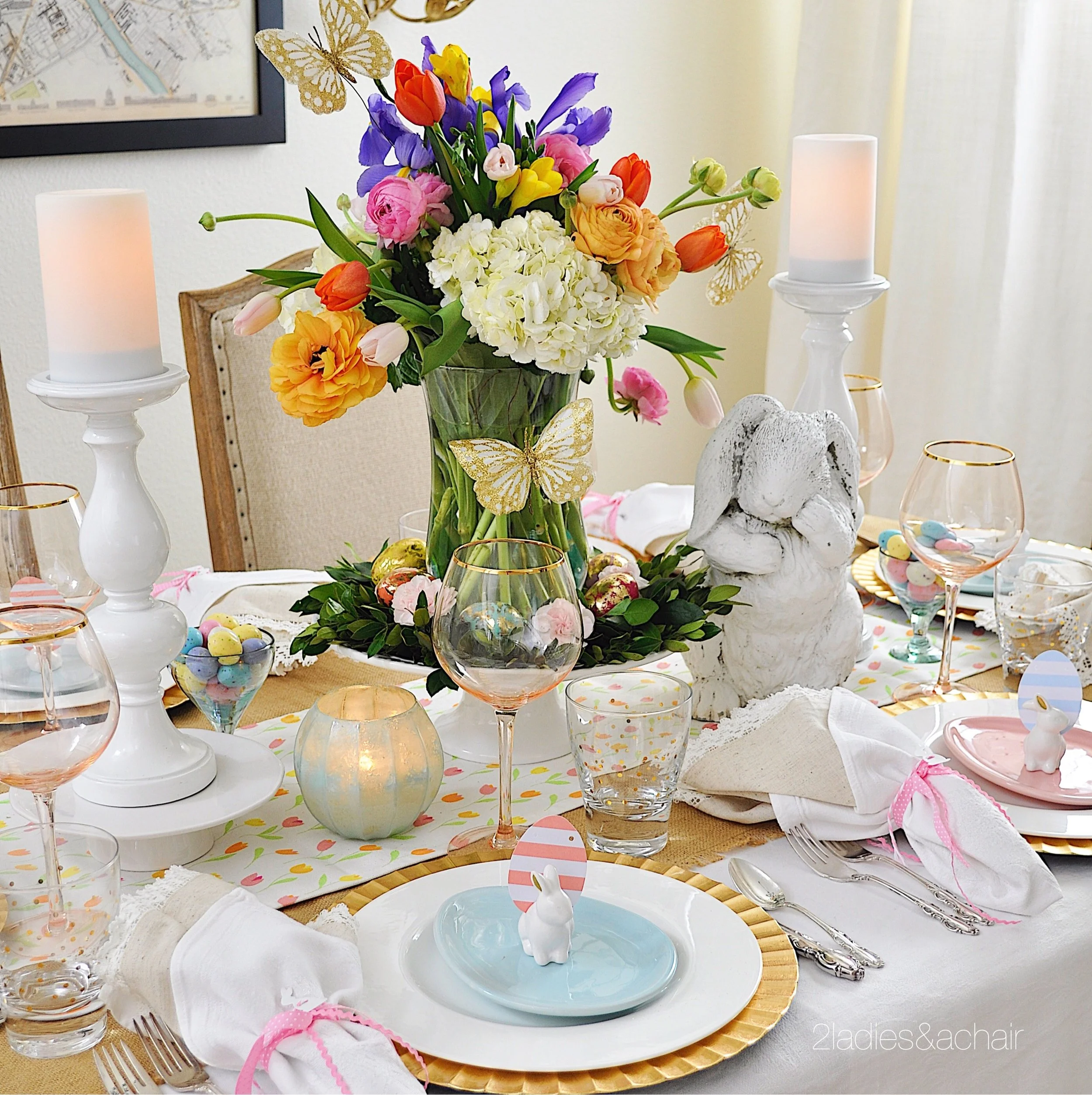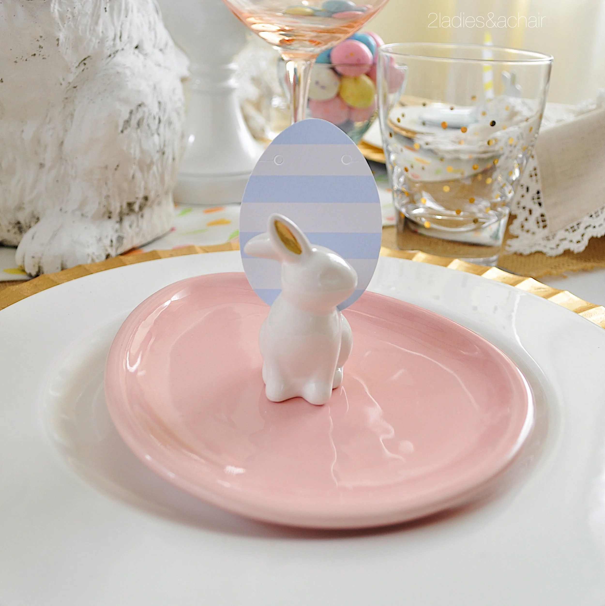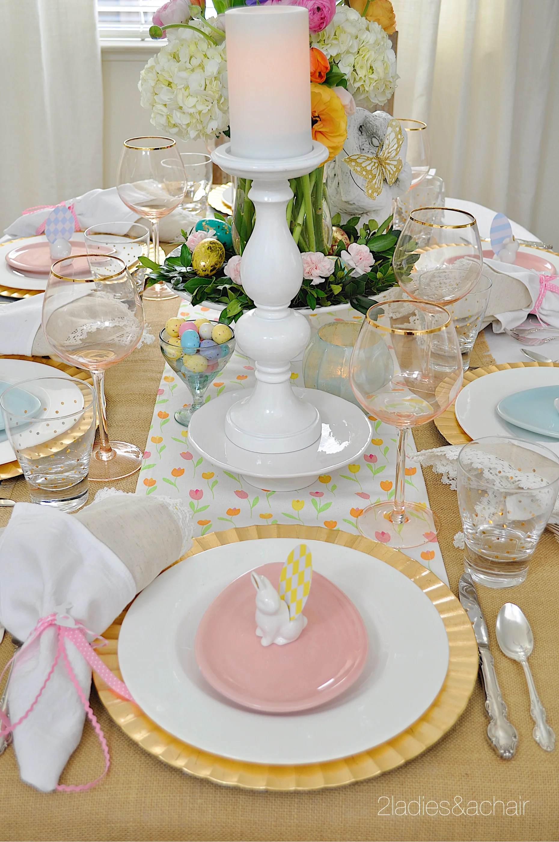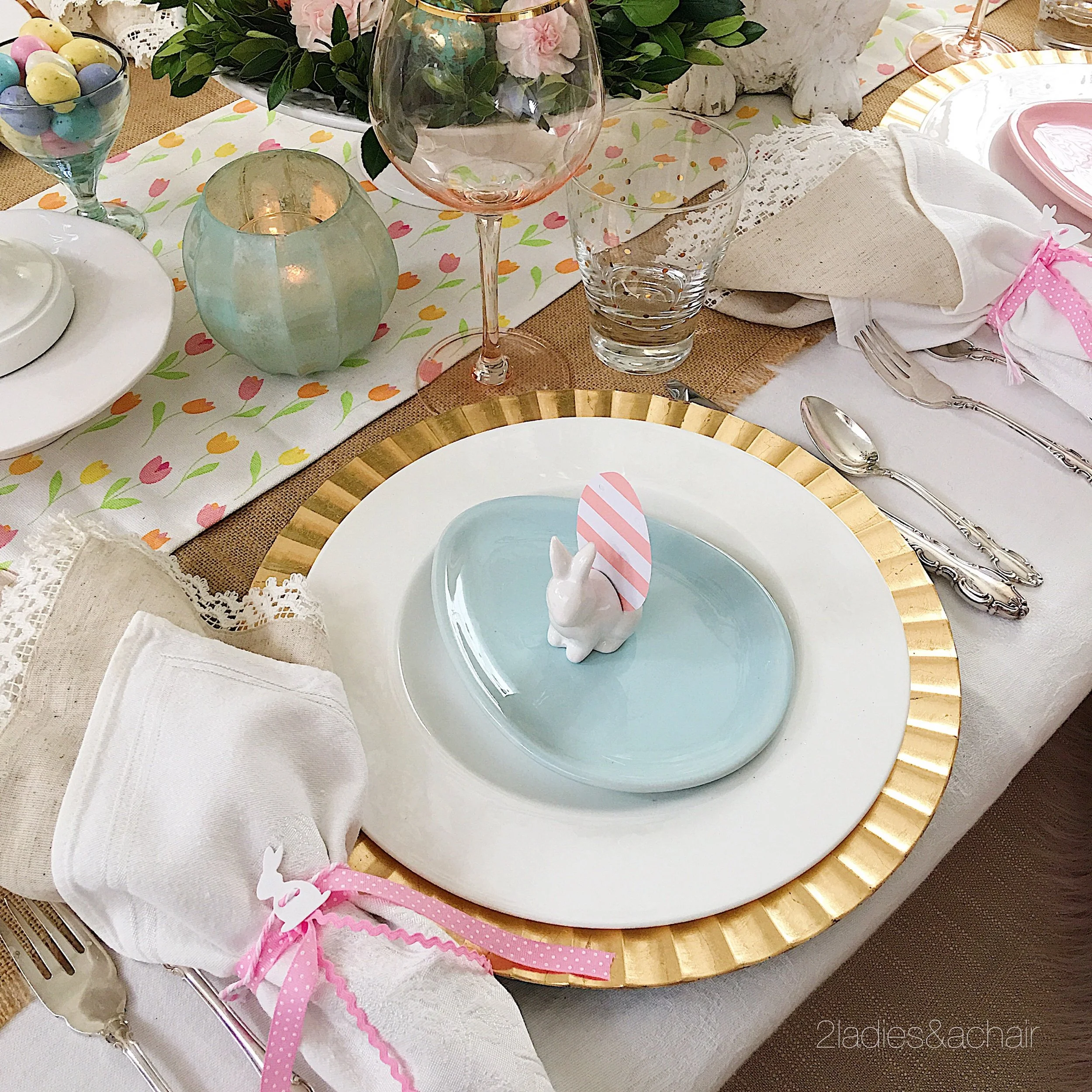 Gold chargers add beautiful sparkle to the table. The pink and blue egg shaped plates are so perfect for an Easter table setting!