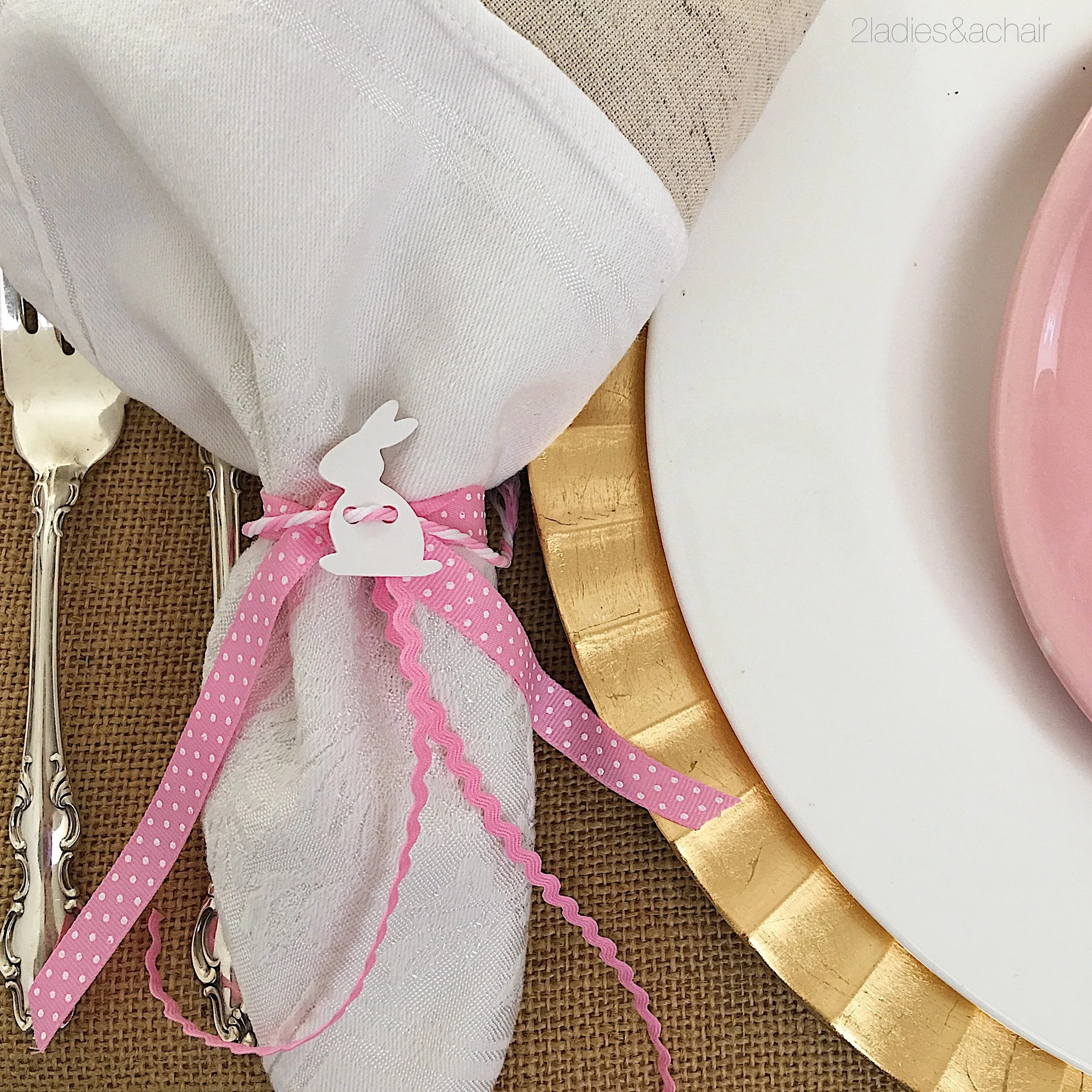 Sometimes it's the little touches that add so much in design. Pretty pink ribbon, rick-rack, and tiny paper bunnies become simple napkin rings.