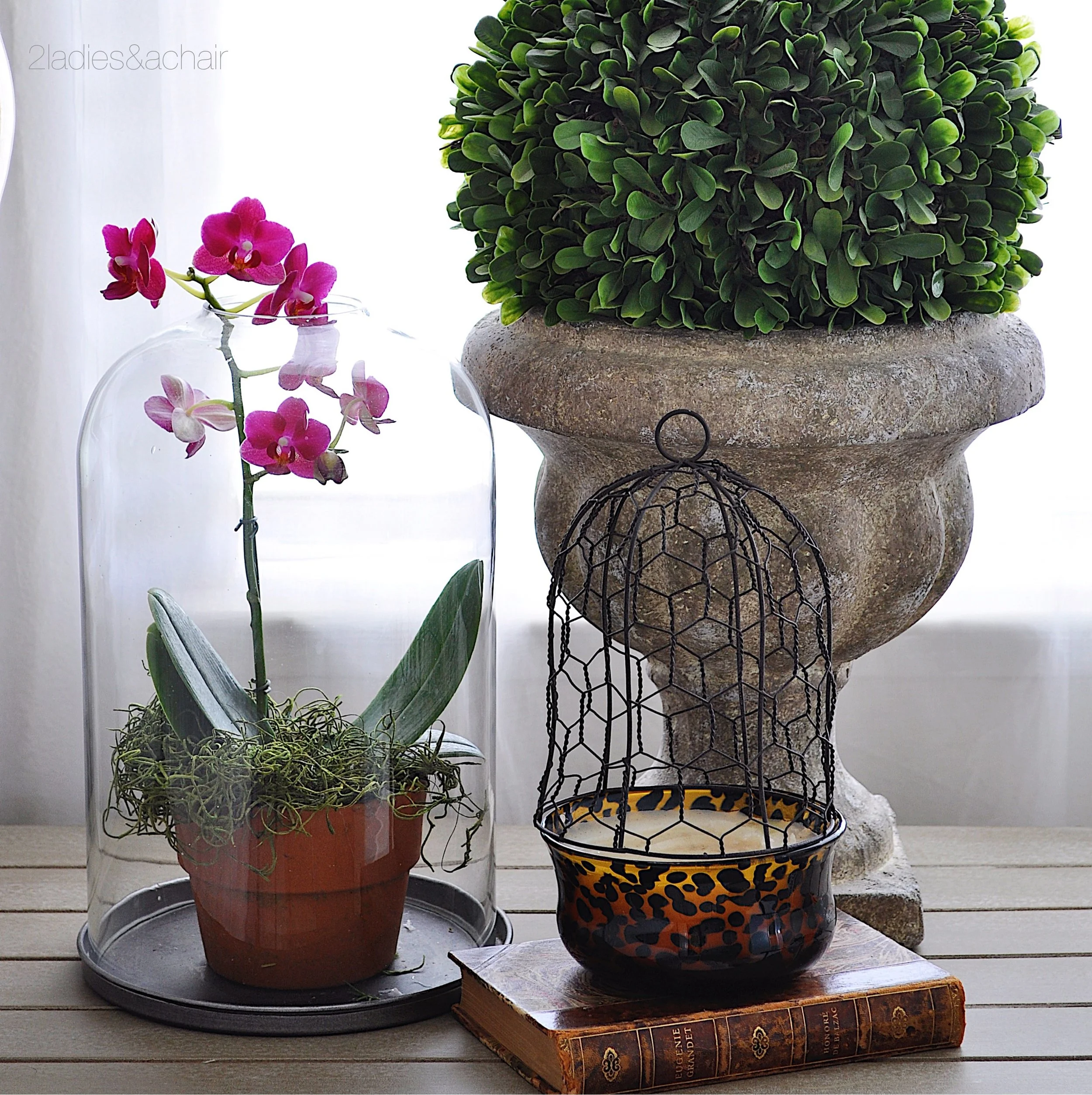 This little $2 orchid from the farmer's market will give months of beauty on this nightstand. The faux topiary is a beautiful way to add "no care" greenery and liven up any space.
