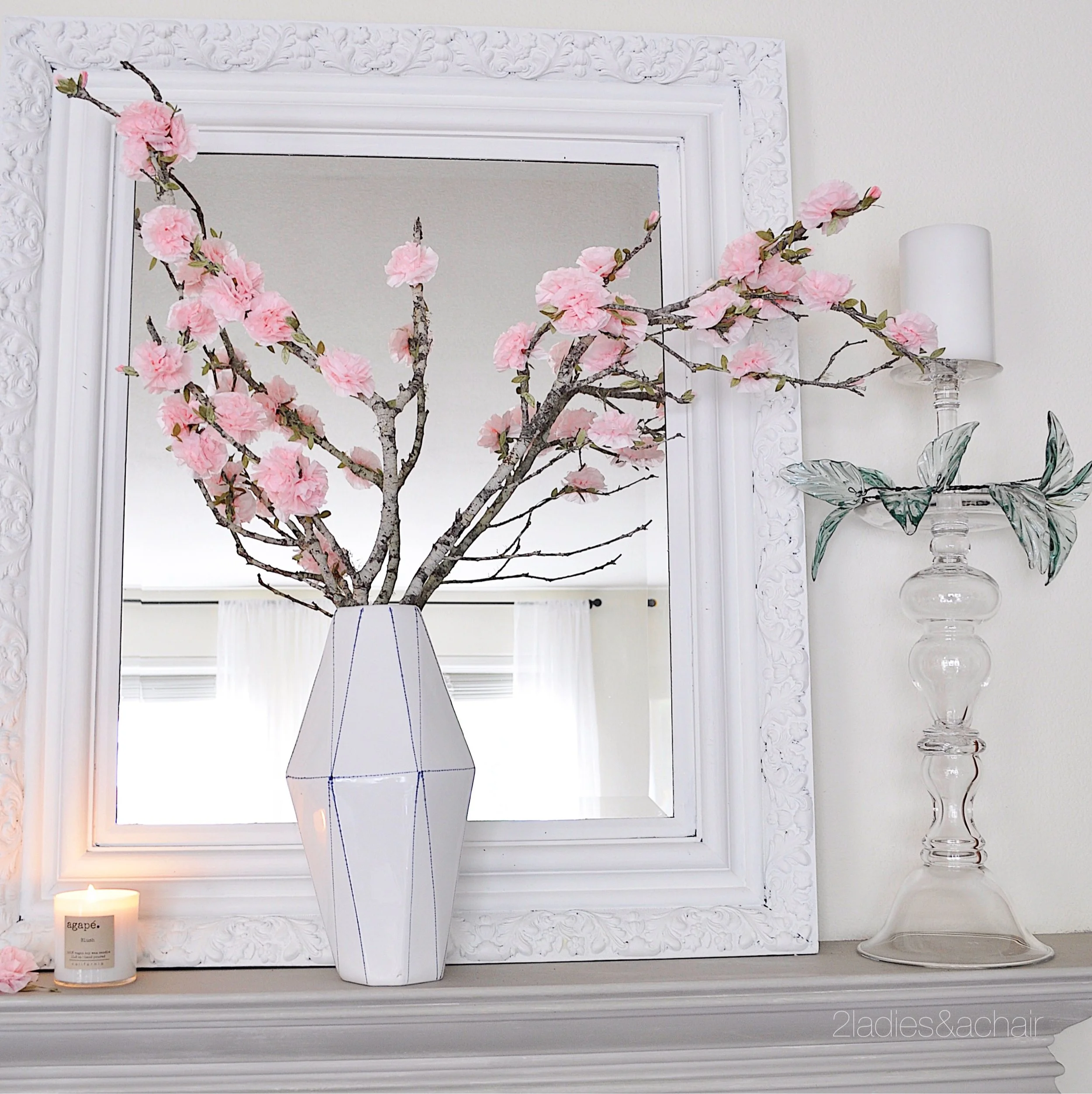 I was having a difficult time forcing blooms on branches this year. I was inspired by my friend Janine at Happy Happy Nester to make my own cherry blossoms! If I can do it, so can you. Click here for a link to make your own cherry blossom branches.