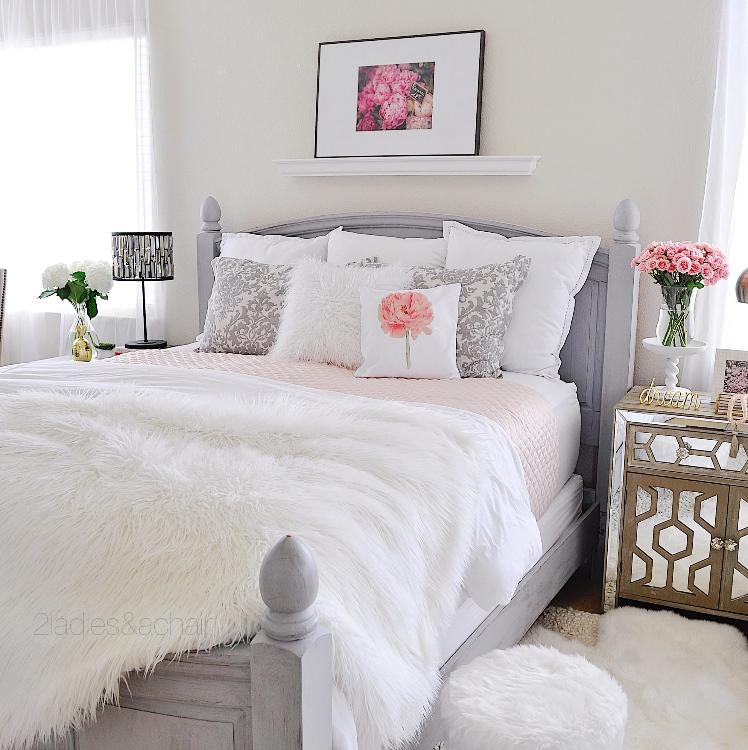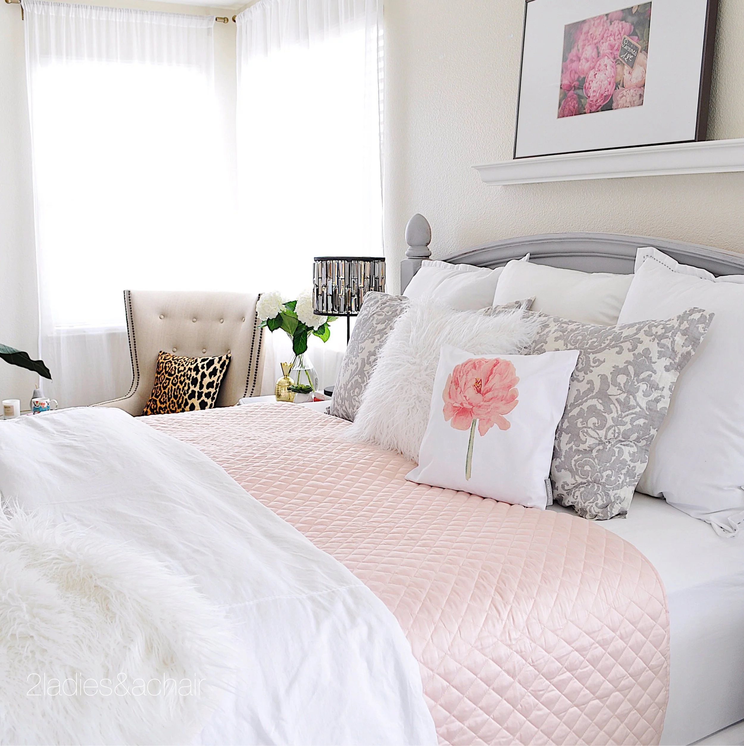 Luckily, changing the look of the bed can be as easy as changing the linens. Your choice of bed linens can change your bed to be romantic, tailored, layered, luxurious, or plain. For the bedding I went to HomeGoods. It was my lucky day because waiting for me was this king size blush pink quilt! I wanted the pink to pop so everything else I kept white, except for a bit of grey in the shams to tie into the painted bed color.