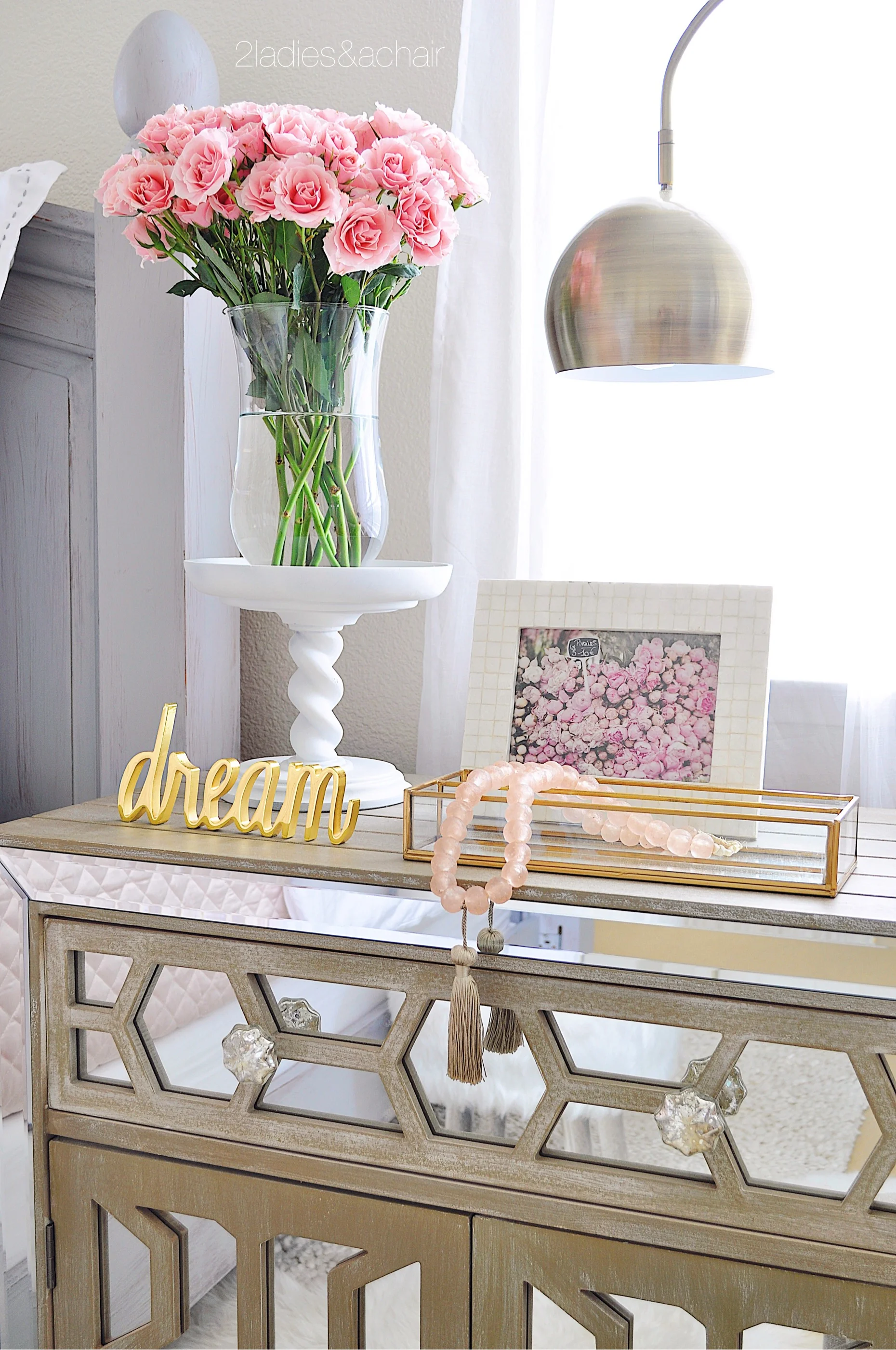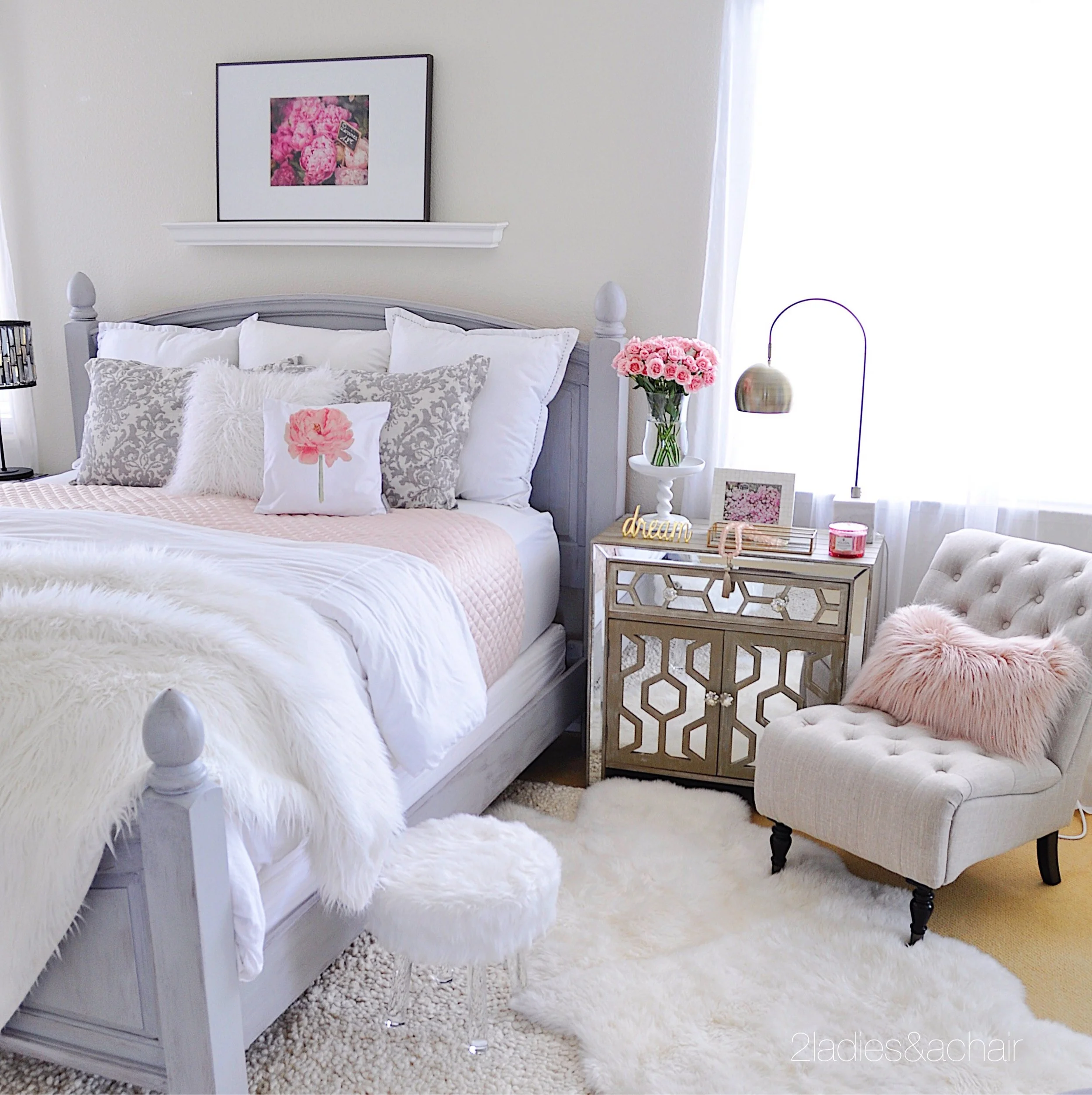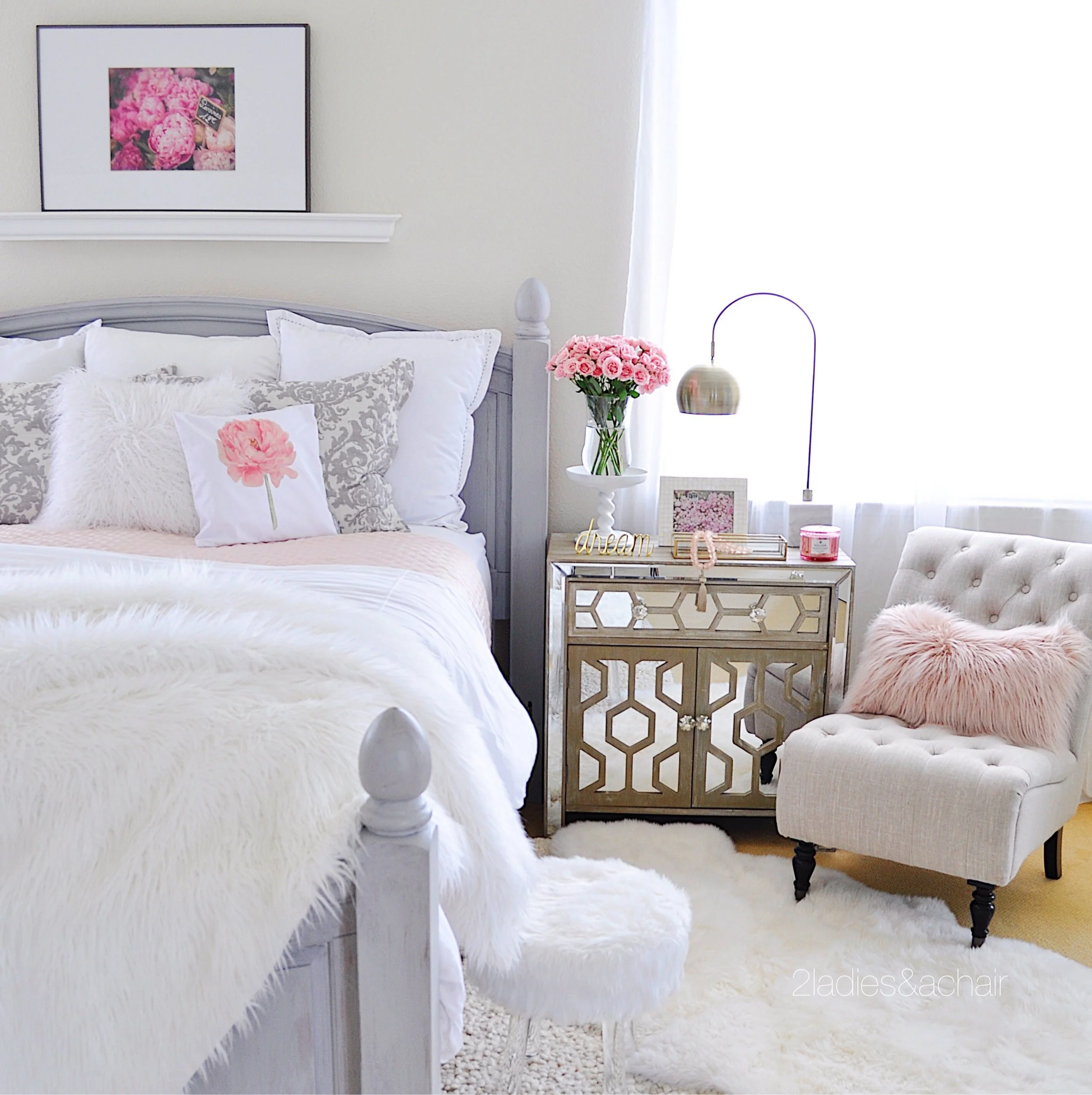 When I saw this gorgeous print of peonies, I knew I had to have it. That and the pretty peony pillow are the inspiration for my bedroom. I hung a ledge above the headboard for interest, then I leaned the artwork against the wall. Since I live in California, this artwork is wired to screws so that in case an earthquake happens it won't fall off.