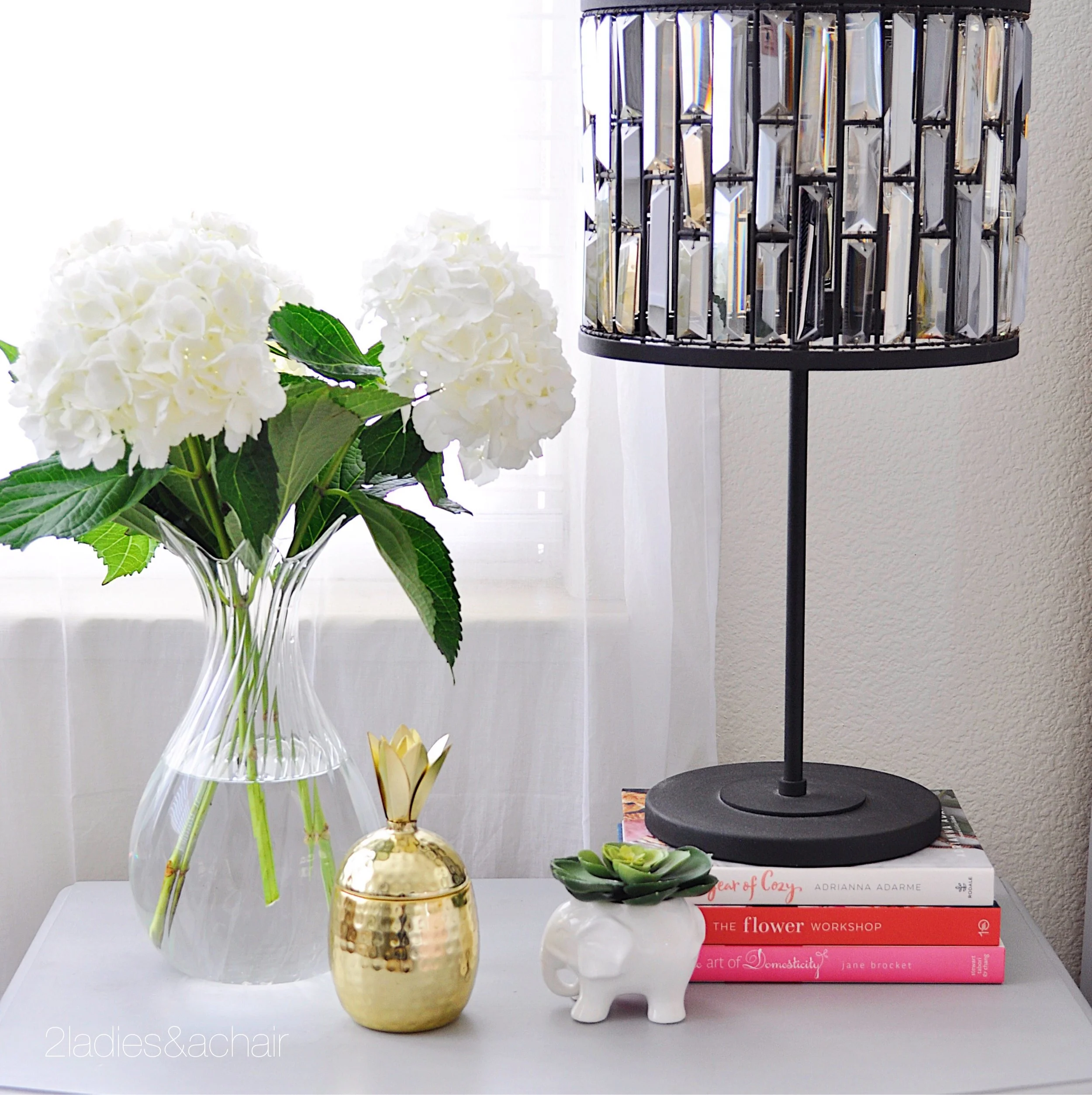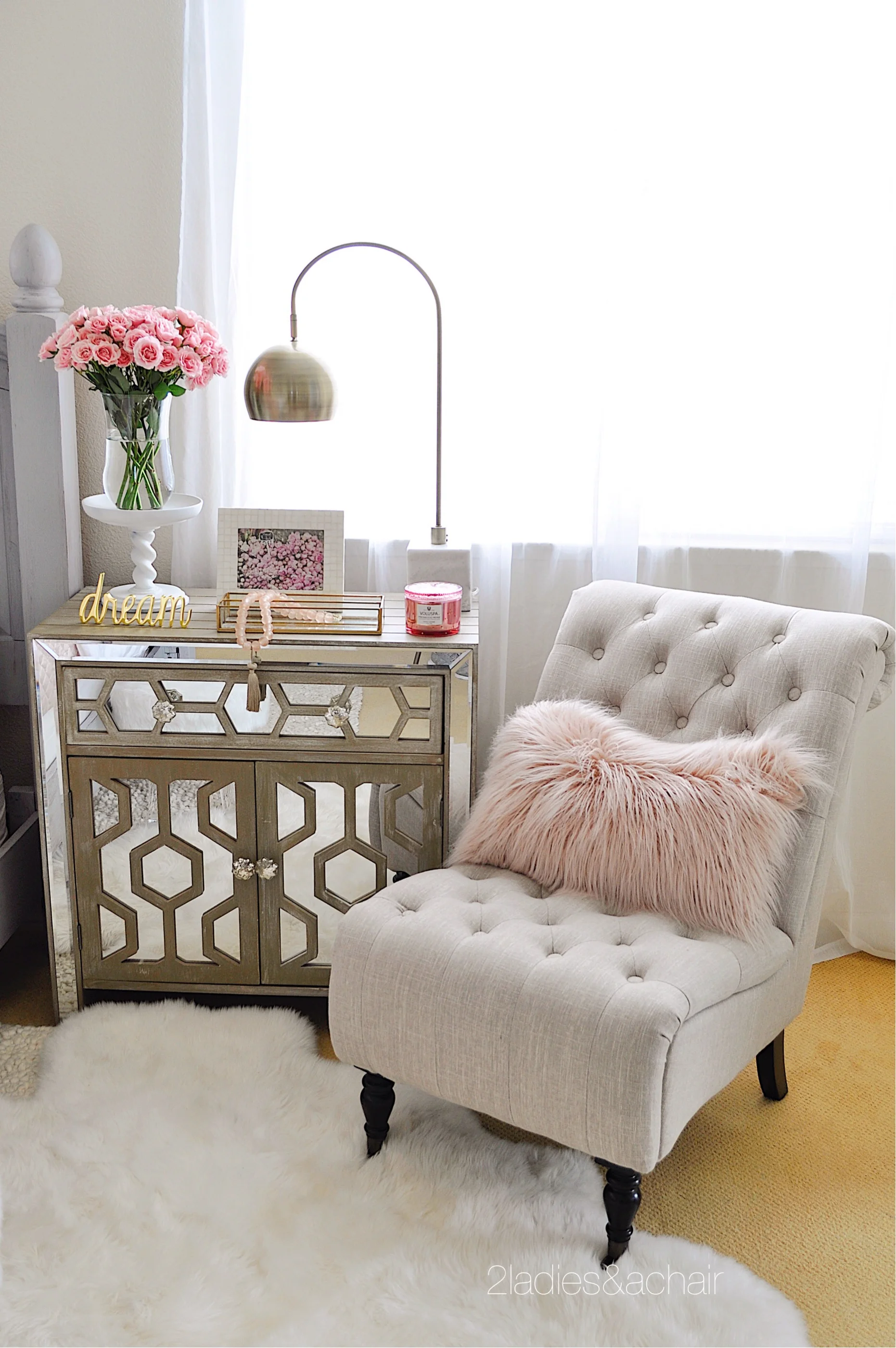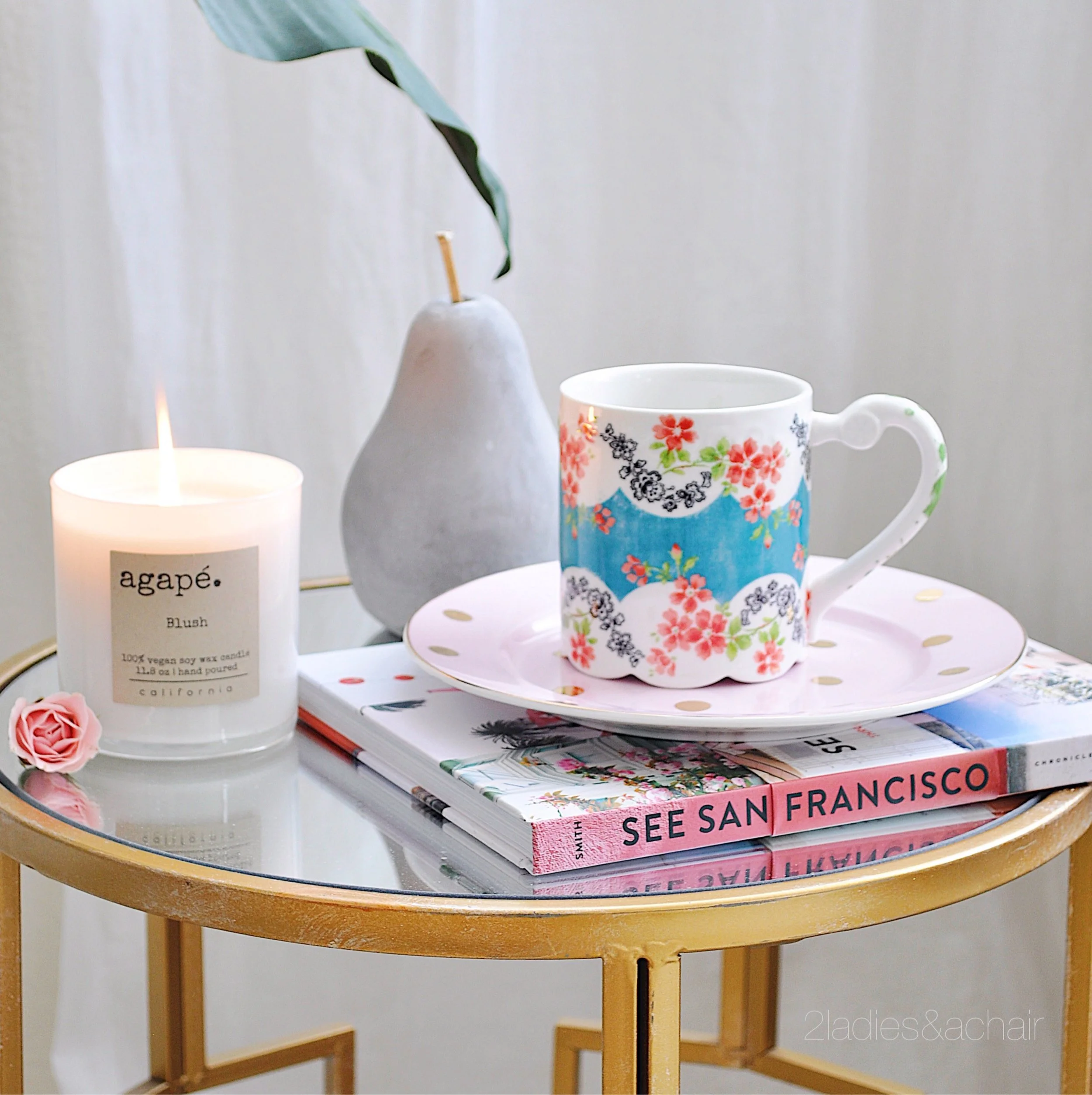 When I saw this gorgeous print of peonies, I knew I had to have it. That and the pretty peony pillow are the inspiration for my bedroom. I hung a ledge above the headboard for interest, then I leaned the artwork against the wall. Since I live in California, this artwork is wired to screws so that in case an earthquake happens it won't fall off.