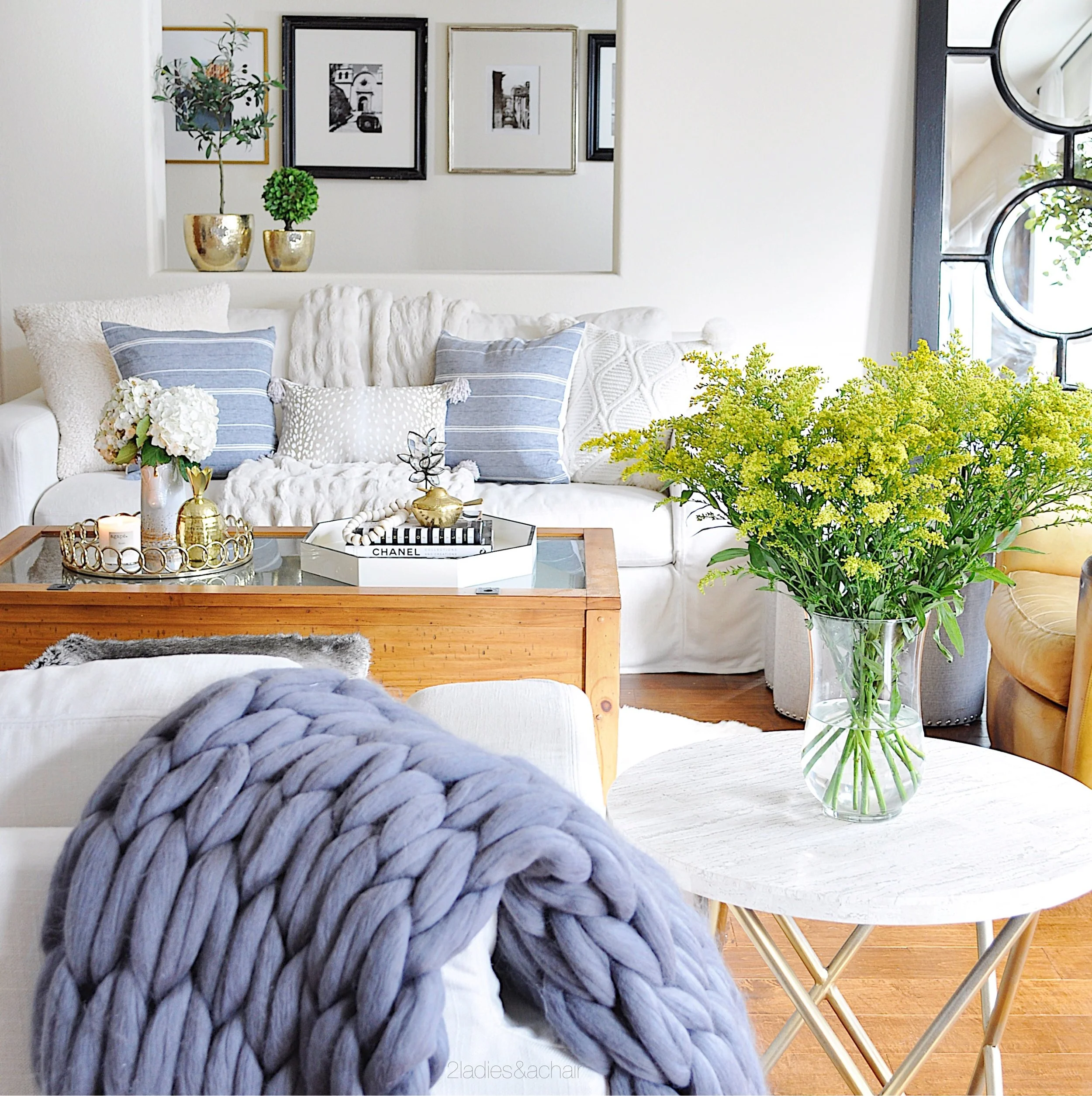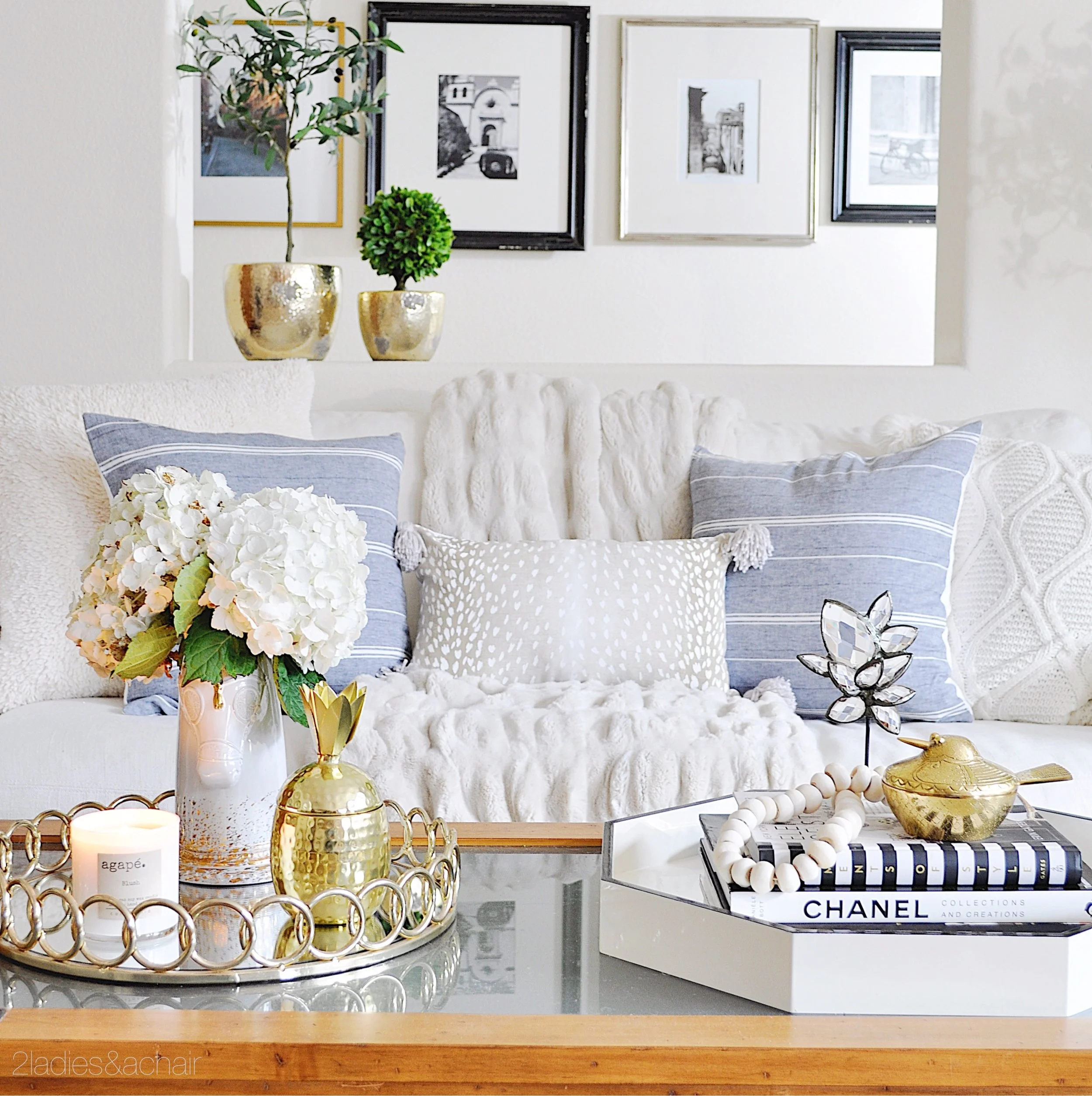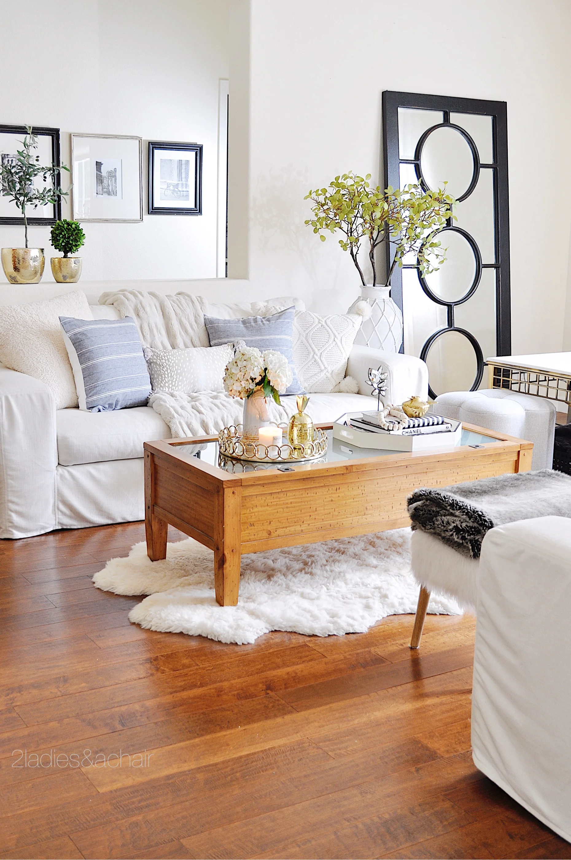I've put ottomans in front of chairs for relaxed seating. Candles are on almost every surface. All my vases have been filled with long lasting flowers like hydrangeas or faux greens.