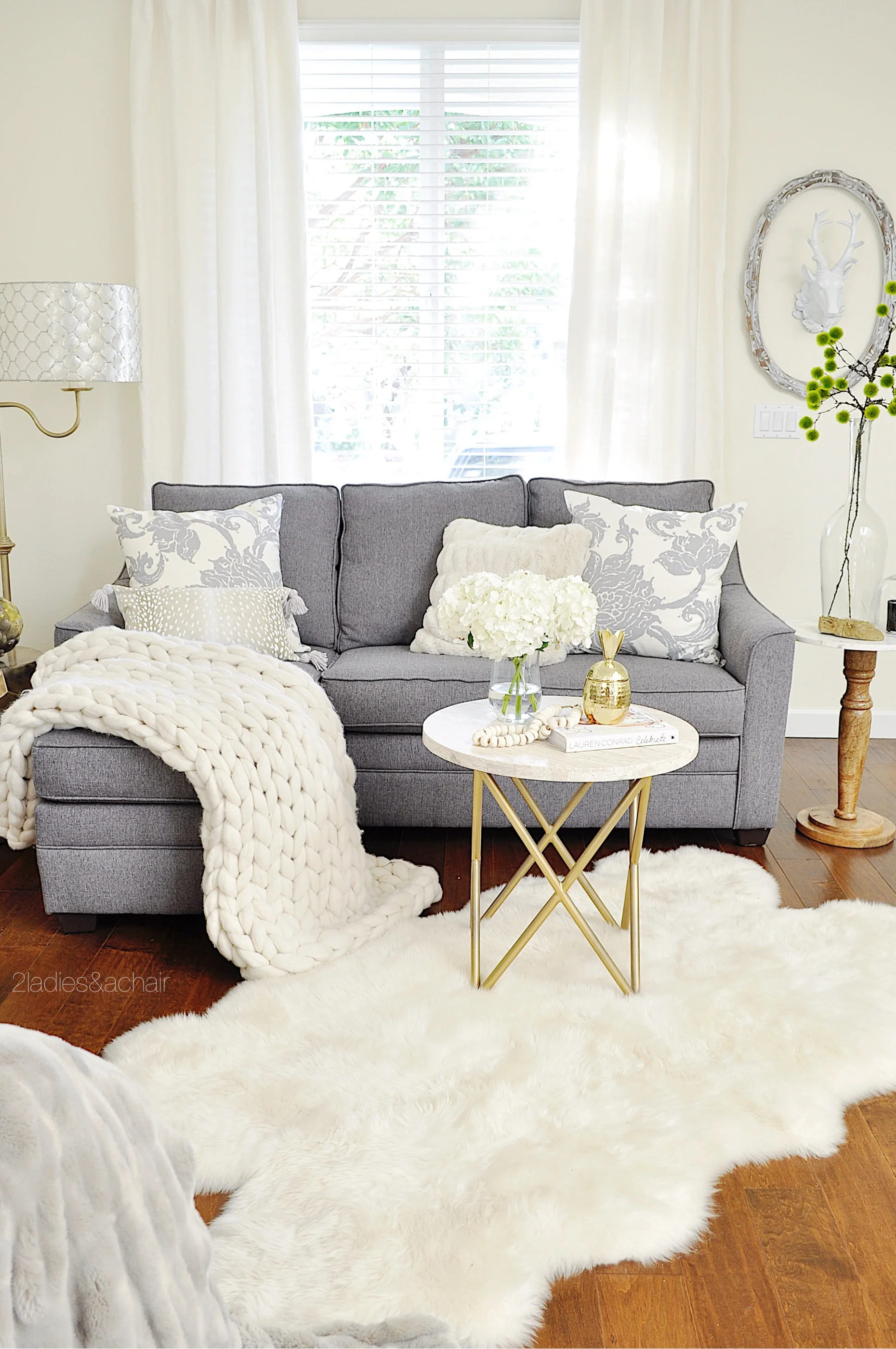 Instead of battling the cold gloomy winter, I have decided to embrace it. I am getting cozy in my home decor. My colors are simplified to winter white, grey, and gold. Layers of texture was added when I got out all my comfy throws and placed them throughout my home.