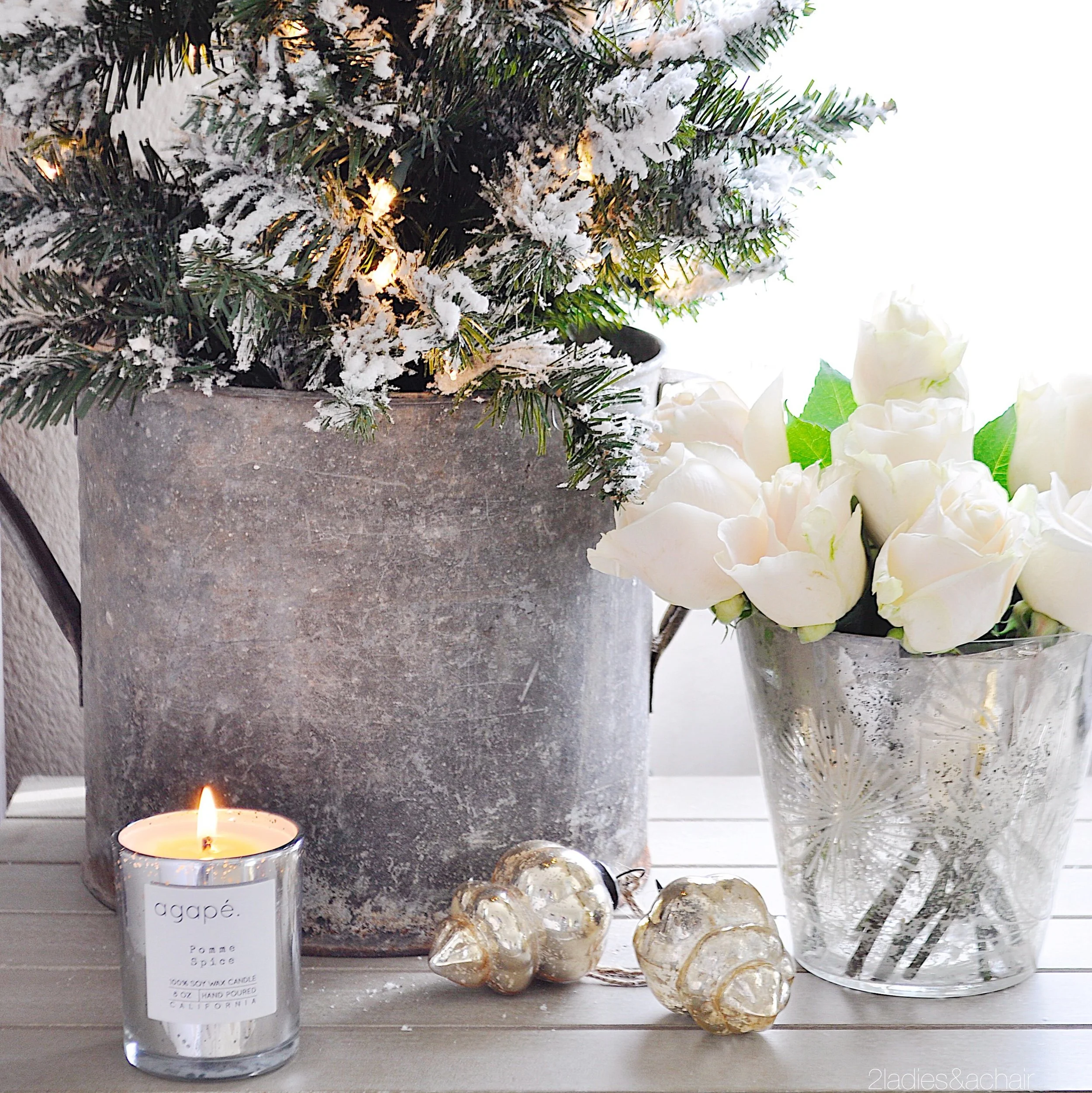 I love to bring in a seasonal scent when I decorate. This Pomme Spice scented candle has a fabulous subtle winter scent. I love the festive metallic vessel too. Agape Candles are the best!