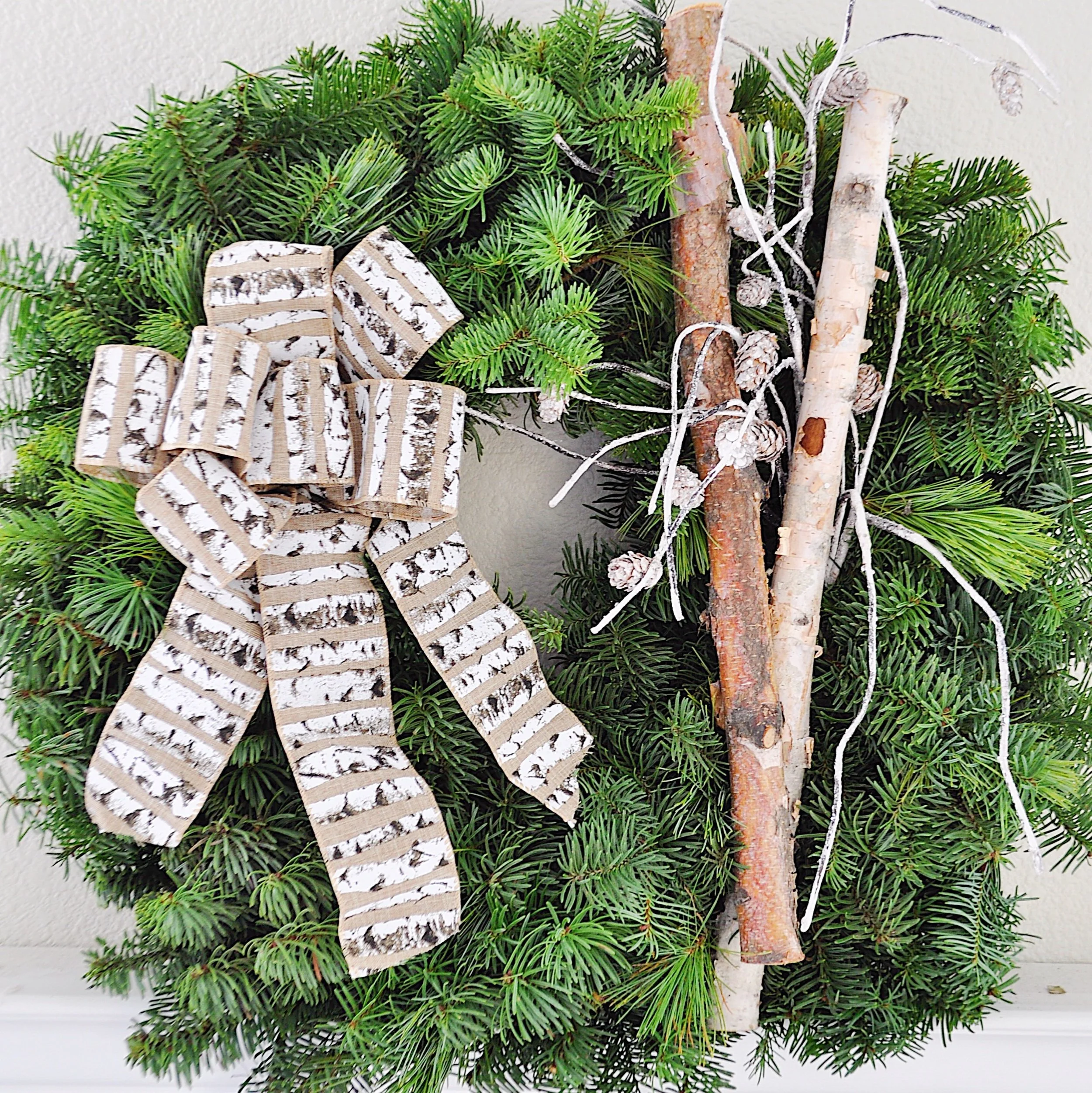 This 26 inch elegant wreath has a beautiful natural feel with birch branches, silver pine cones and a pretty birch ribbon! I added a string of battery twinkle lights on a timer, so when I go to bed it acts as a gorgeous nightlight.