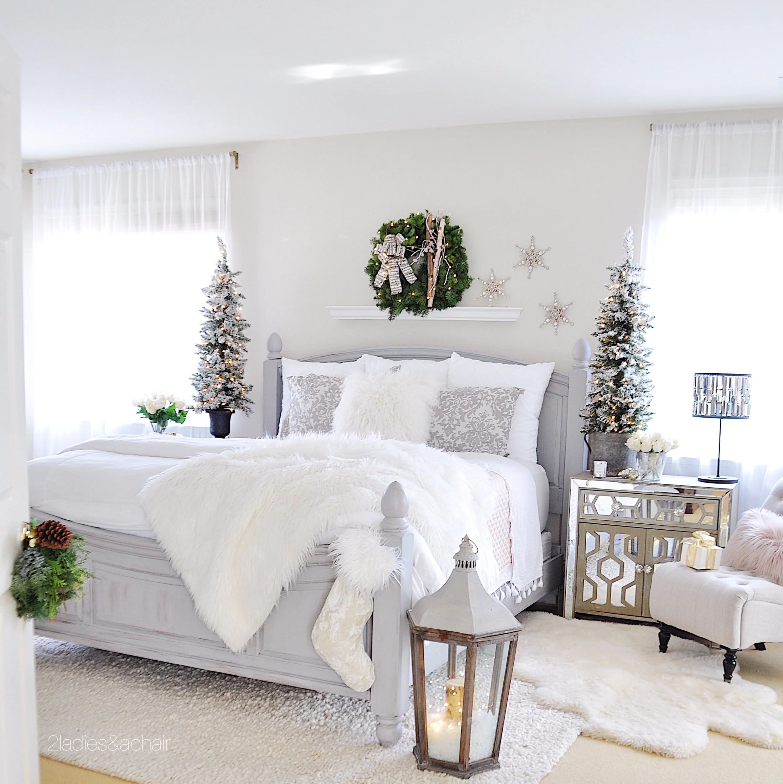 My lit trees are from HomeGoods. I bought them for my front porch years ago. I decided to try them in my bedroom and love the results! No ornaments needed here for my simple display. The faux snow gives the effect of a winter wonderland. Thinking of snow, I grabbed a few snowflake ornaments off the tree and hung them on the wall to compliment the winter rustic luxe theme.