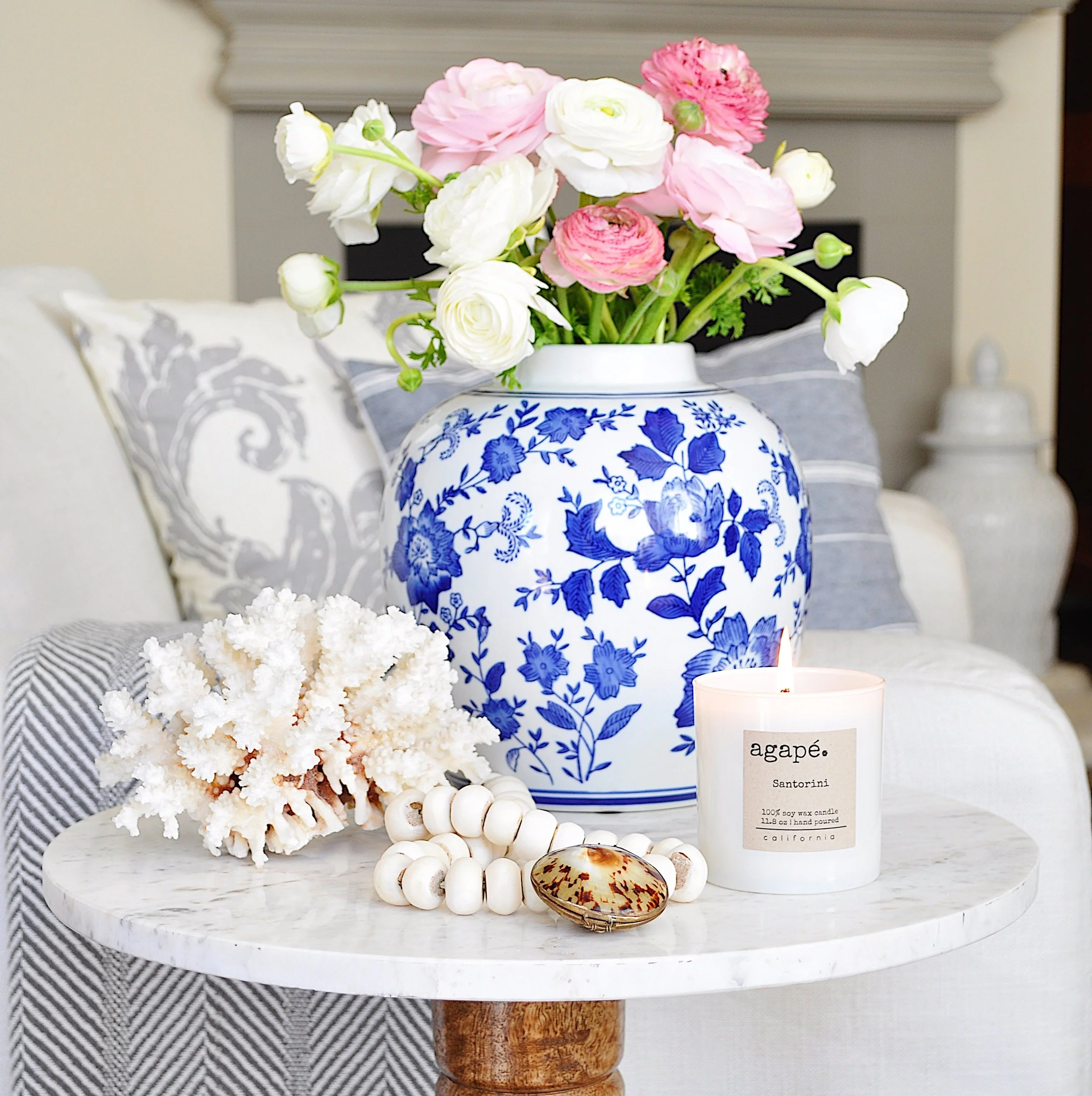 Bring the spring vibe inside your home with greenery. Plants add so much to a room. If you don't have a green thumb try a couple of cut branches off a shrub or tree. I also like using faux plants.
