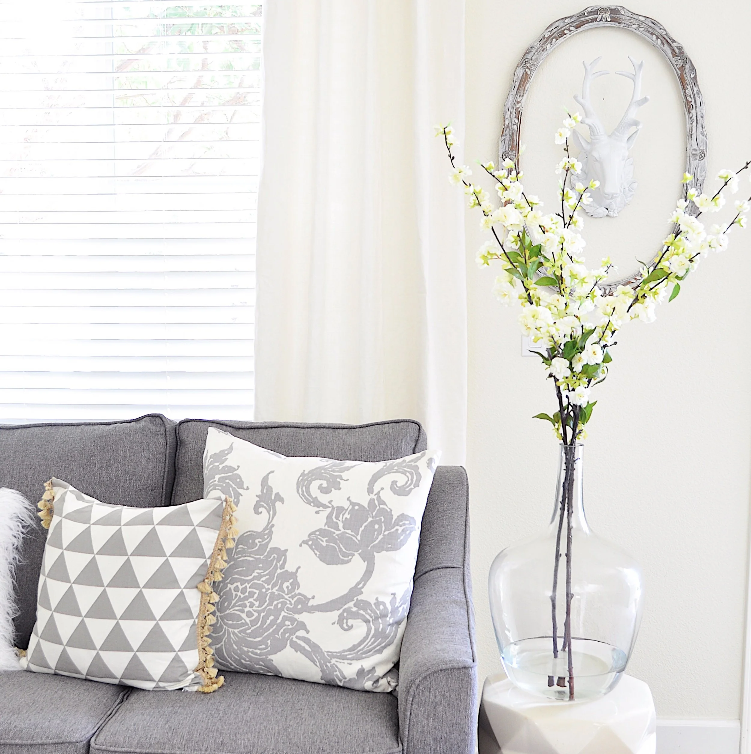 My living room sofa was kept simple and lighten with linen cotton textured pillows. I used a lot of white to lighten the dark sofa for spring. I love the floral print in here. I have kept out my chunky knit throws for unexpected cool spring nights.