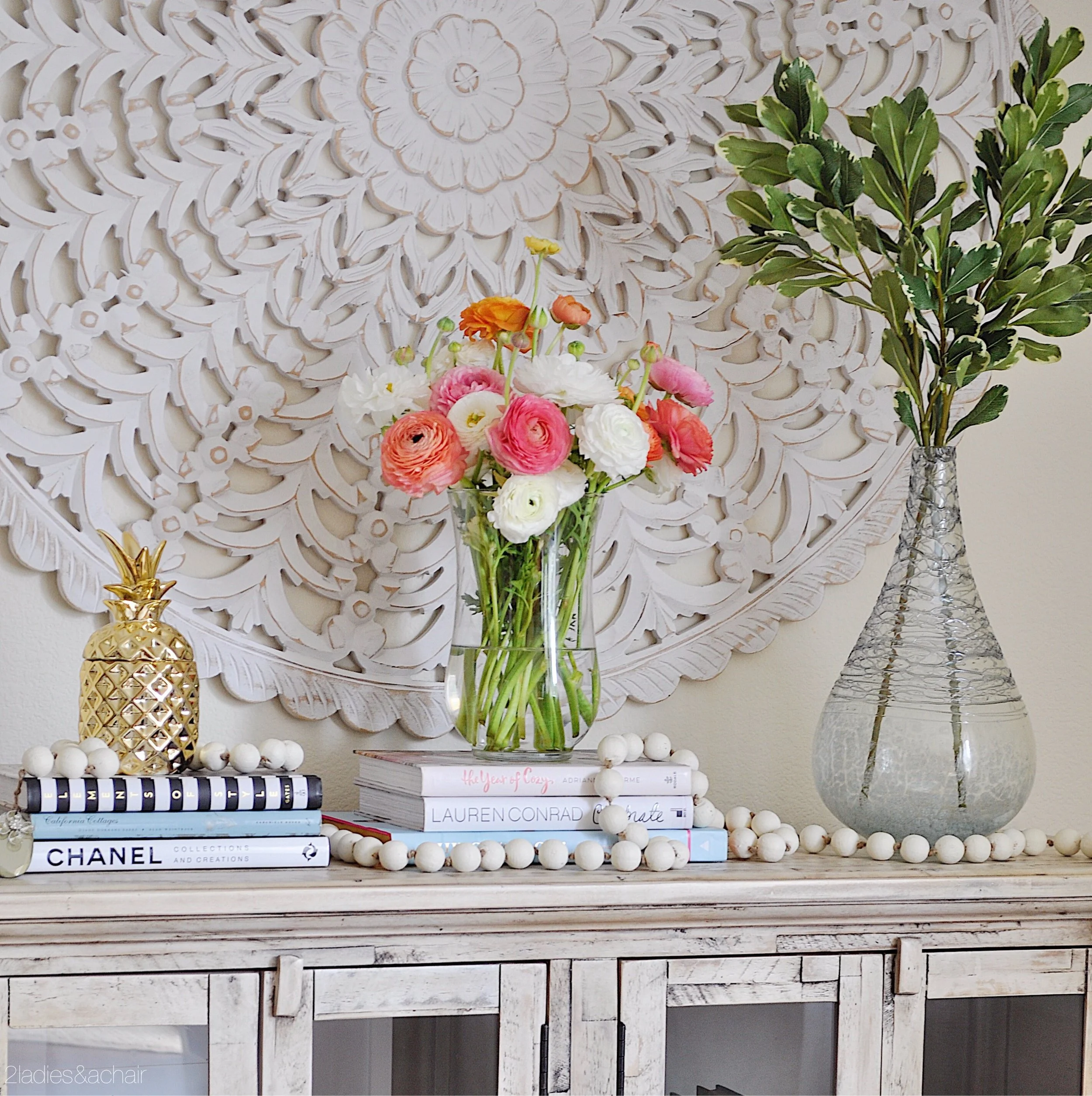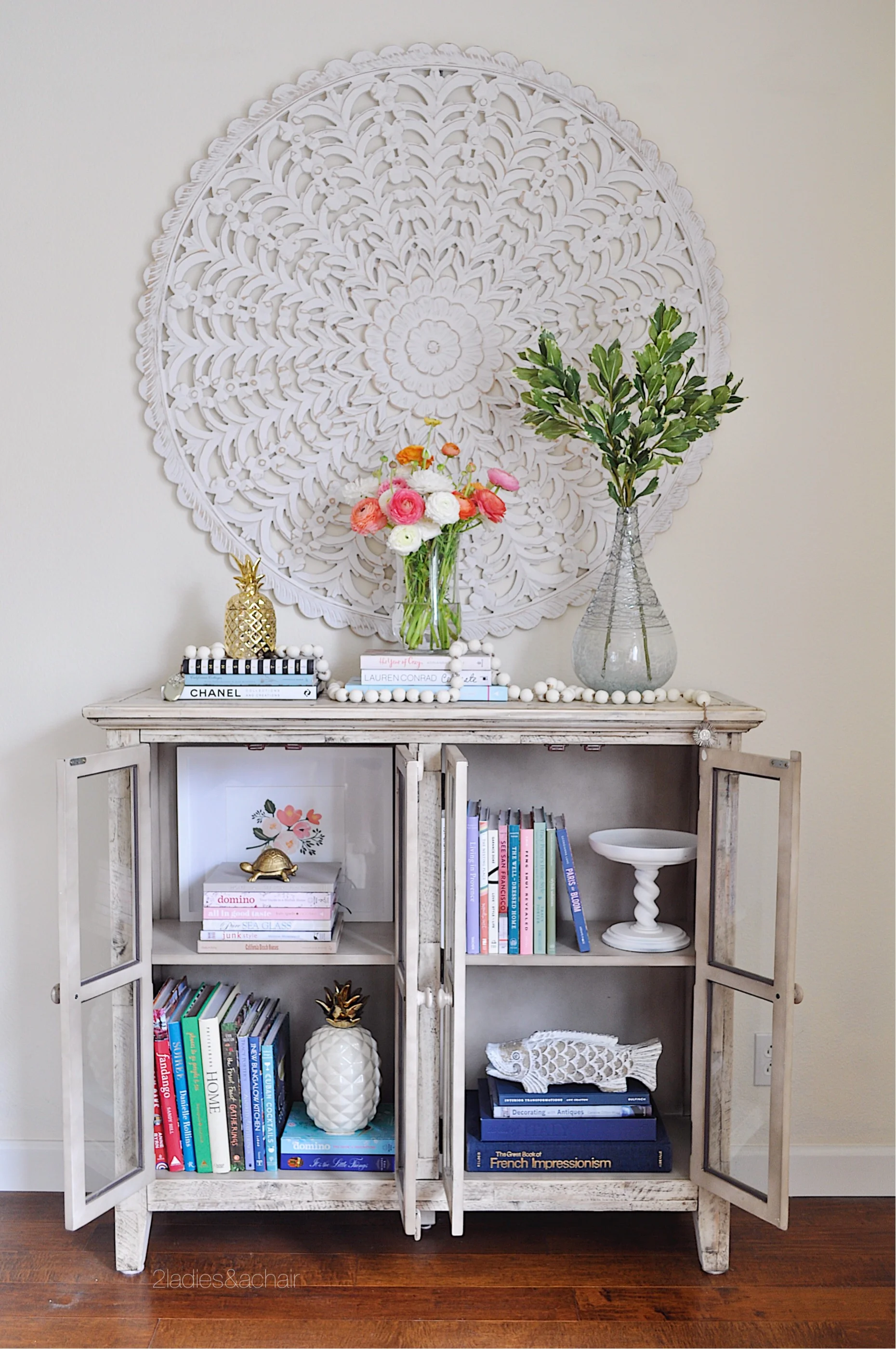To decorate the top of the cabinet, I continued the book theme. A couple of matching lamps would also be pretty, but since I have a floor lamp right next to this piece I went with fresh blooms and plant stems for spring.