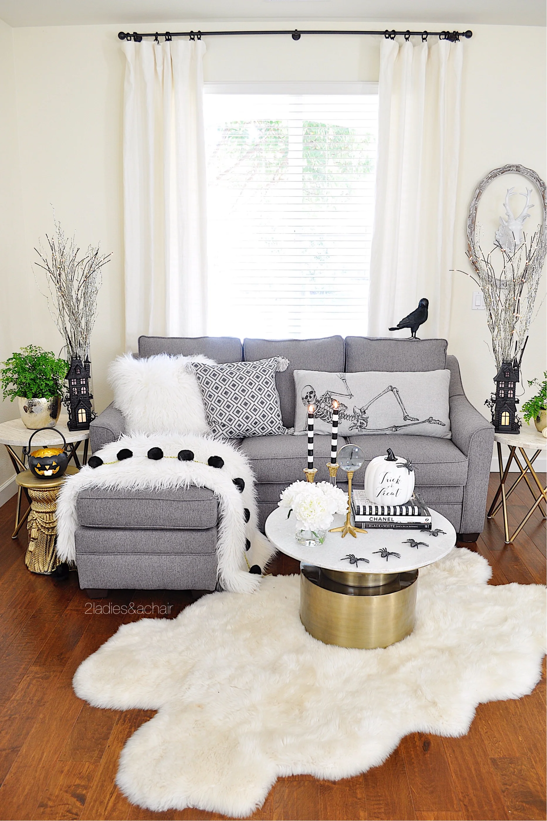 The store was full of fabulously spooky Halloween decor! After deciding on the skeleton pillow my theme quickly emerged: skulls, skeletons, and any spooky thing that’s black, grey, or white. Once I had my theme, the decorating plan was easy.